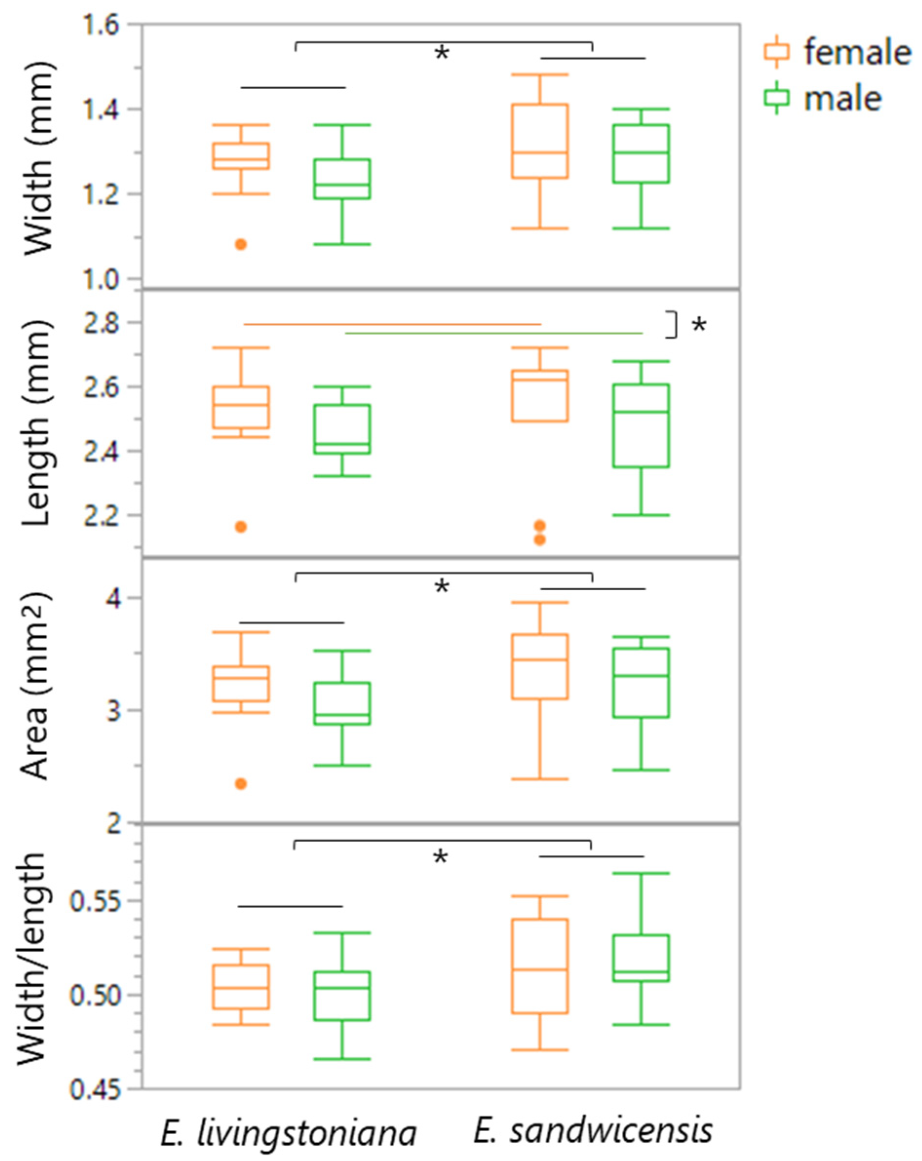 Figure 6. Box plots of adult morphological traits (elytron width, length, area, and width/length ratio) by sex of Specularius impressithorax emerging from Erythrina livingstoniana and E. sandwicensis (Wiliwili). Elytral width, area, and width/length ratio were different between rearing plant species, while elytral length was different between sexes, but not between rearing plants. *: p < 0.05.