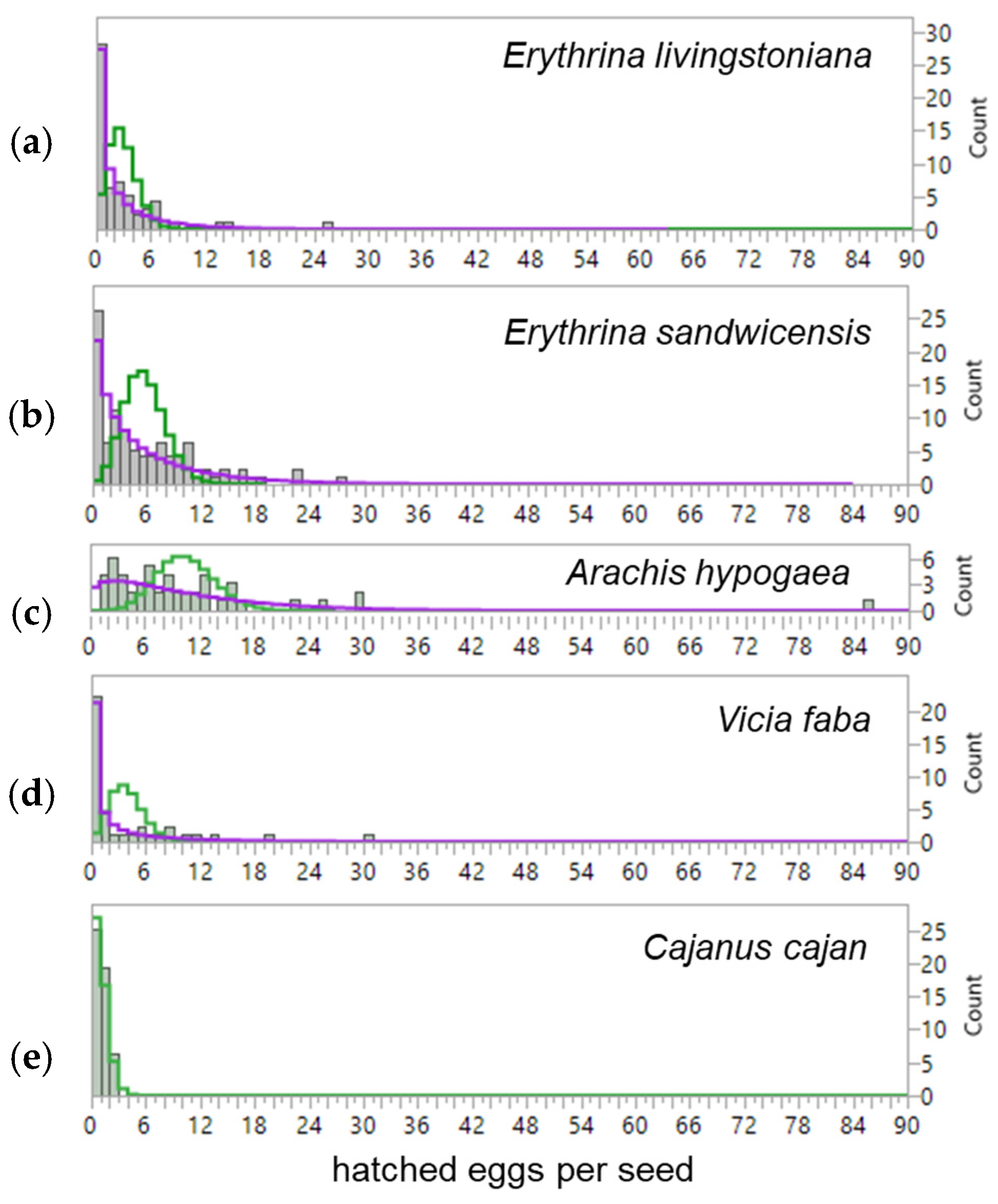 More eggs were laid on Wiliwili (E. sandwicensis) than on E. livingstoniana in the field (Table 1): up to 33 eggs per E. sandwicensis seed and 26 per E. livingstoniana seed, comparable to a previous report of up to 38 eggs per field-collected E. sandwicensis seed [22]. Egg distributions on both Erythrina species followed negative-binomial rather than Poisson distributions, indicating aggregation (Table 1). Hatched-egg distributions were also negative-binomial for both Erythrina hosts and for peanuts and broad beans, but Poisson-distributed for pigeon pea (Figure A3).