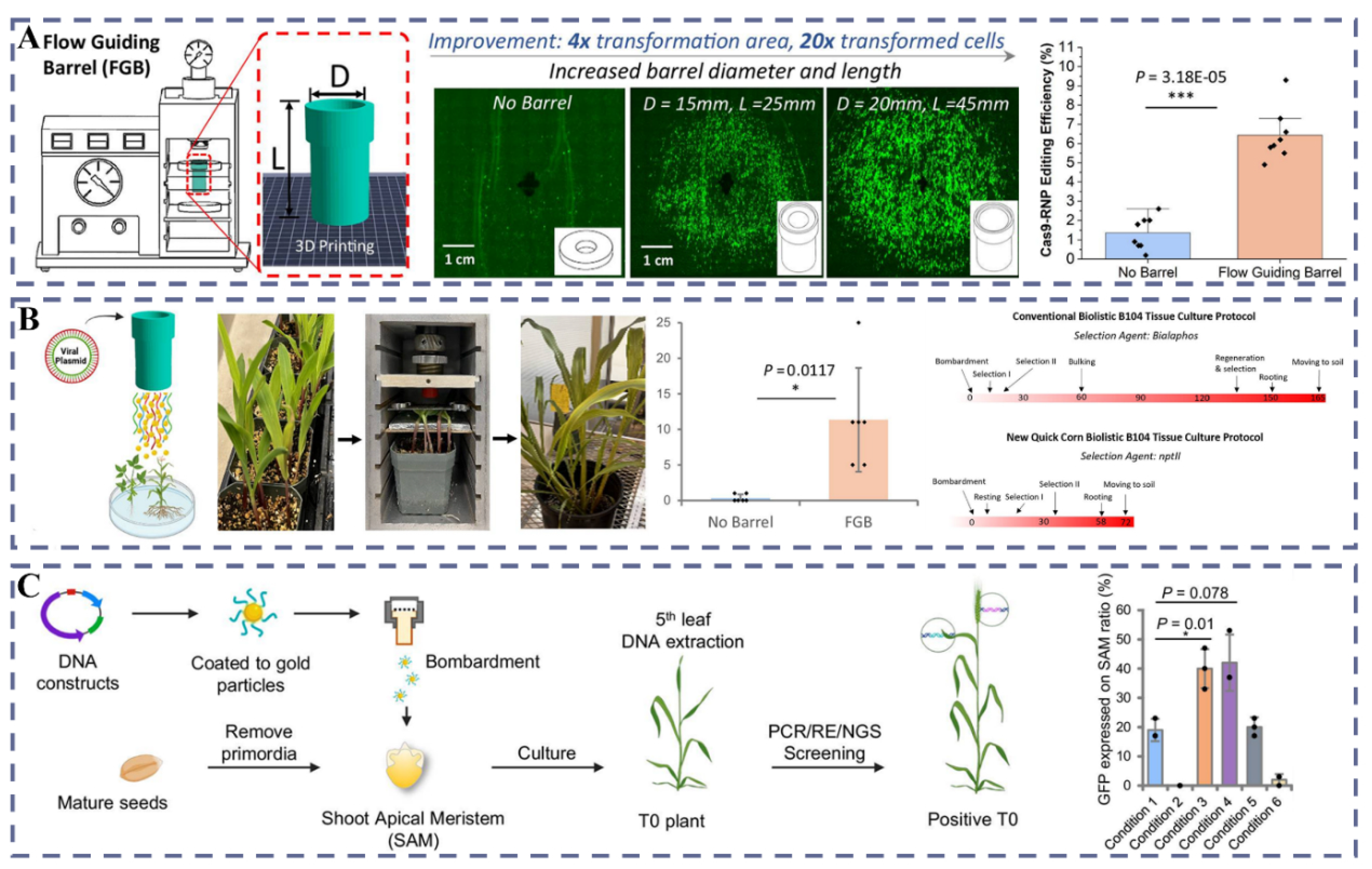 Figure 1. (A) Illustration of FGB setup in the gene gun, 3D-printed barrel design, and GFP-DNA delivery to onion cells with different FGB geometries. (B) Schematic and image of young sweet corn, FGB setup, and 4-week post-bombardment infection. (C) Illustration of DNA construct delivery to wheat SAM via biolistics. Reprinted with permission from ref. [50], Copyright 2025, Springer Nature. * p < 0.05; *** p < 0.001.