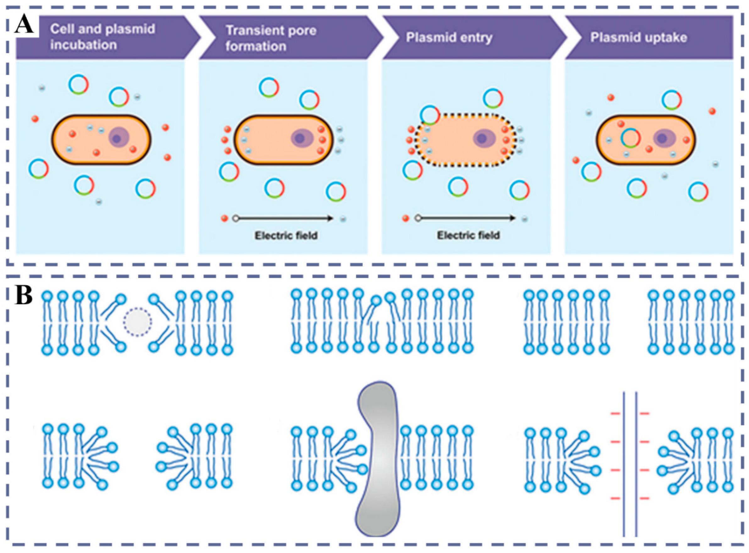 Figure 2. (A) Electroporation-assisted plant genetic transformation involves four steps; reprinted with permission from ref. [11], Copyright 2022, UNITED STATES. (B) The mechanism of electroporation. Reprinted with permission from ref. [52], Copyright 2003, USA.