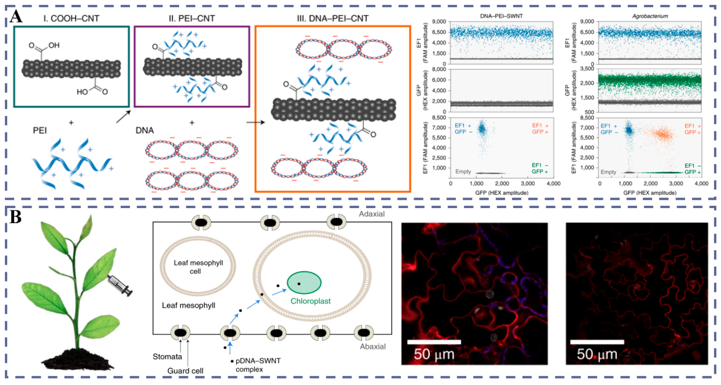 Figure 5. (A) DNA grafting onto PEI-modified carboxylated CNTs was achieved through electrostatic attachment. Subsequent ddPCR analysis showed that while CNT-delivered DNA resulted in no transgene integration, Agrobacterium-mediated delivery led to high-frequency GFP integration events; reprinted with permission from ref. [79], Copyright 2019, Springer Nature. (B) Chloroplast-specific gene delivery is achieved using chitosan-functionalized SWNTs, which carry pDNA through stomata and cellular barriers into the chloroplast stroma for localized transgene expression, as evidenced by the absence of nuclear GFP signals. Reprinted with permission from ref. [80], Copyright 2019, Springer Nature.