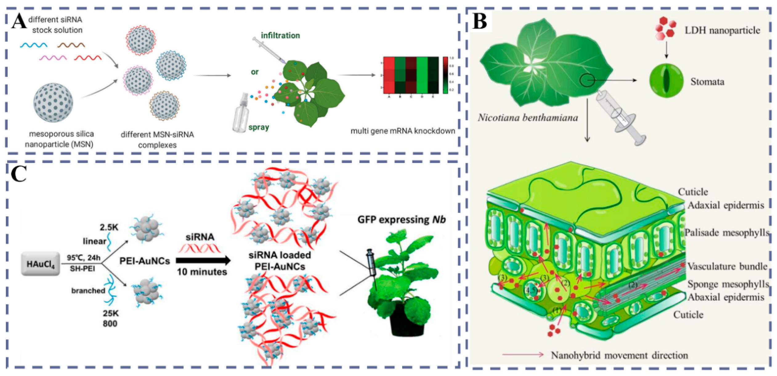 Figure 6. (A) Illustration of MSN-facilitated siRNA delivery for multigene silencing in whole plants. Reprinted with permission from ref. [97], Copyright 2024, Wiley-VCH Verlag. (B) Diagram of LDH nanoparticle uptake and movement within leaves following infiltration. Reprinted with permission from ref. [98], Copyright 2022, American Society of Plant Biologist. (C) Schematic of PEI-AuNC synthesis, siRNA loading via electrostatic adsorption, and infiltration-based delivery for gene silencing in mature mGFP5 Nb leaves. Reprinted with permission from ref. [61], Copyright 2021, American Chemical Society.
