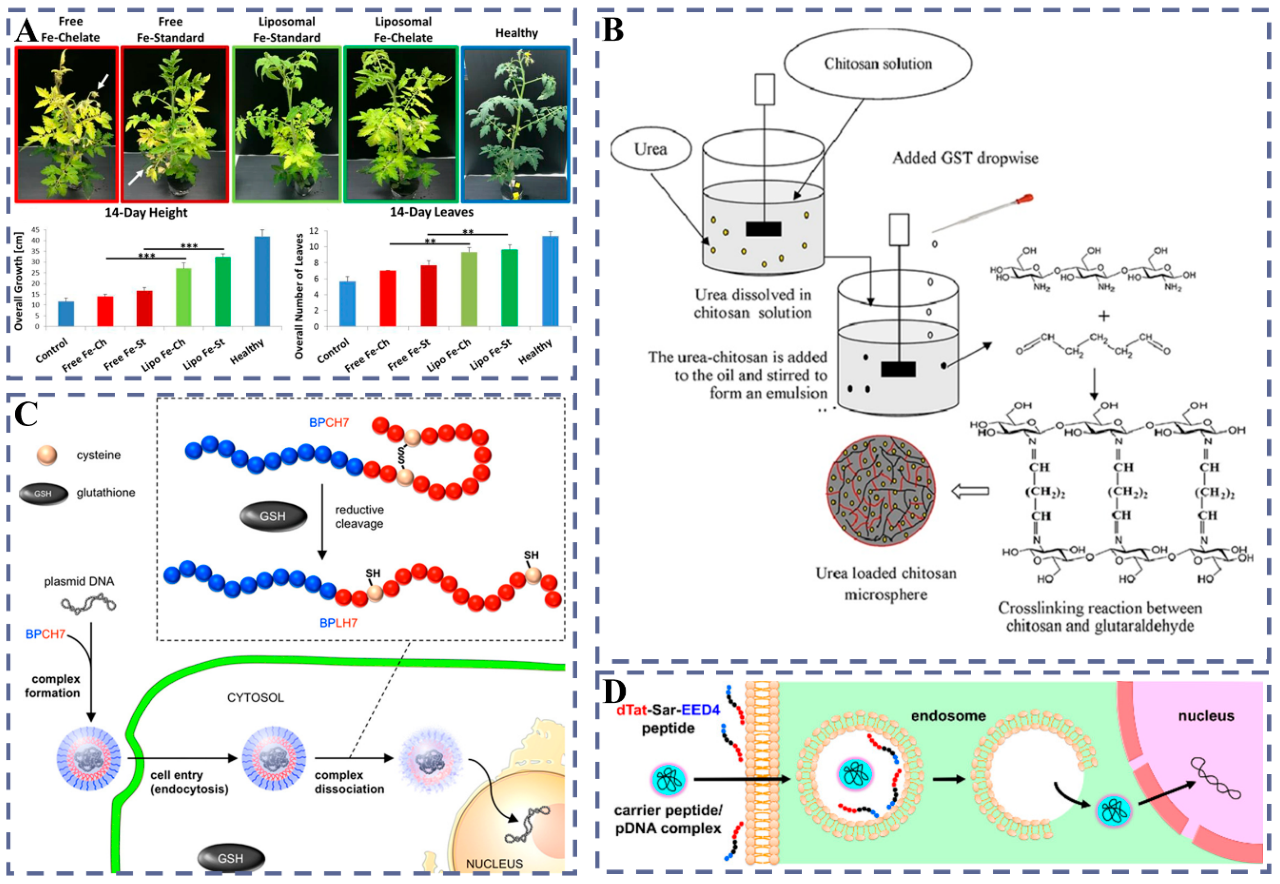 Figure 7. (A) Leaf-applied Fe liposomal supplements effectively restored plant vitality and reduced necrosis. Reprinted with permission from ref. [109], Copyright 2018, Springer Nature. (B) Fabrication of chitosan microspheres for controlled release of urea fertilizer. Reprinted with permission from ref. [122], Copyright 2021, Elsevier. (C) Illustration of the glutathione-reducible peptide (BPCH7) and the proposed mechanism for intracellular delivery and subsequent pDNA release. Reprinted with permission from ref. [128], American Chemical Society, Copyright 2018. (D) Dual-peptide gene-delivery system for efficient plant callus cell transfection. Reprinted with permission from ref. [132], Copy 2020, American Chemical Society. ** p < 0.01; *** p < 0.001.