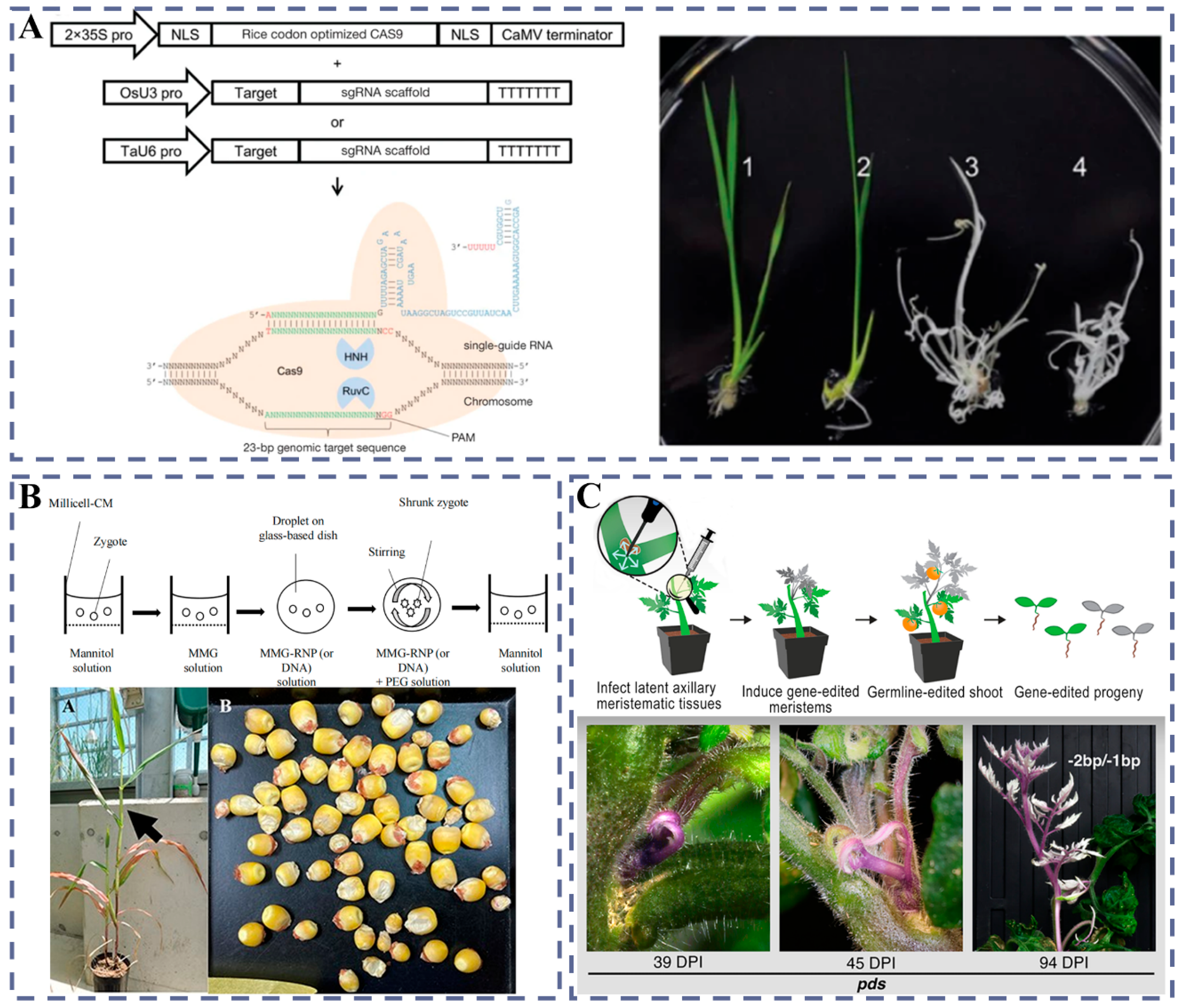 Figure 8. (A) Schematic of the engineered type II CRISPR-Cas system. Cas9’s HNH and RuvC-like domains cleave the target sequence’s strands when the correct PAM sequence is present. NLSs, nuclear localization signals. Reprinted with permission from ref. [148], Copyright 2013, Springer Nature. (B) PEG-mediated delivery of Cas9-gRNA RNPs to maize-B73 zygotes and verification of mutagenesis in regenerated plants; reprinted with permission from ref. [154], Copyright 2024, Oxford University Press. (C) Generation of gene-edited shoots via viral infection of dormant axillary meristematic cells. Reprinted with permission from Ref. [155], Copyright 2024.
