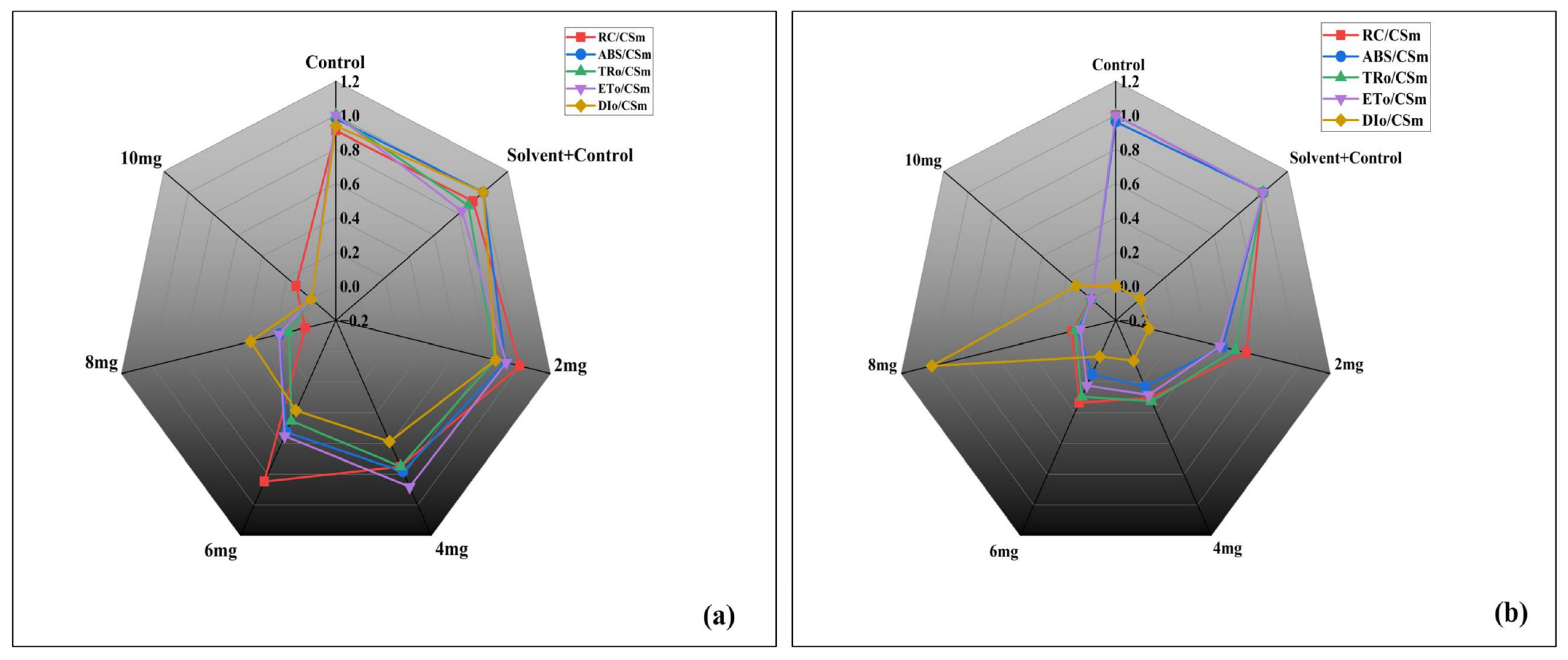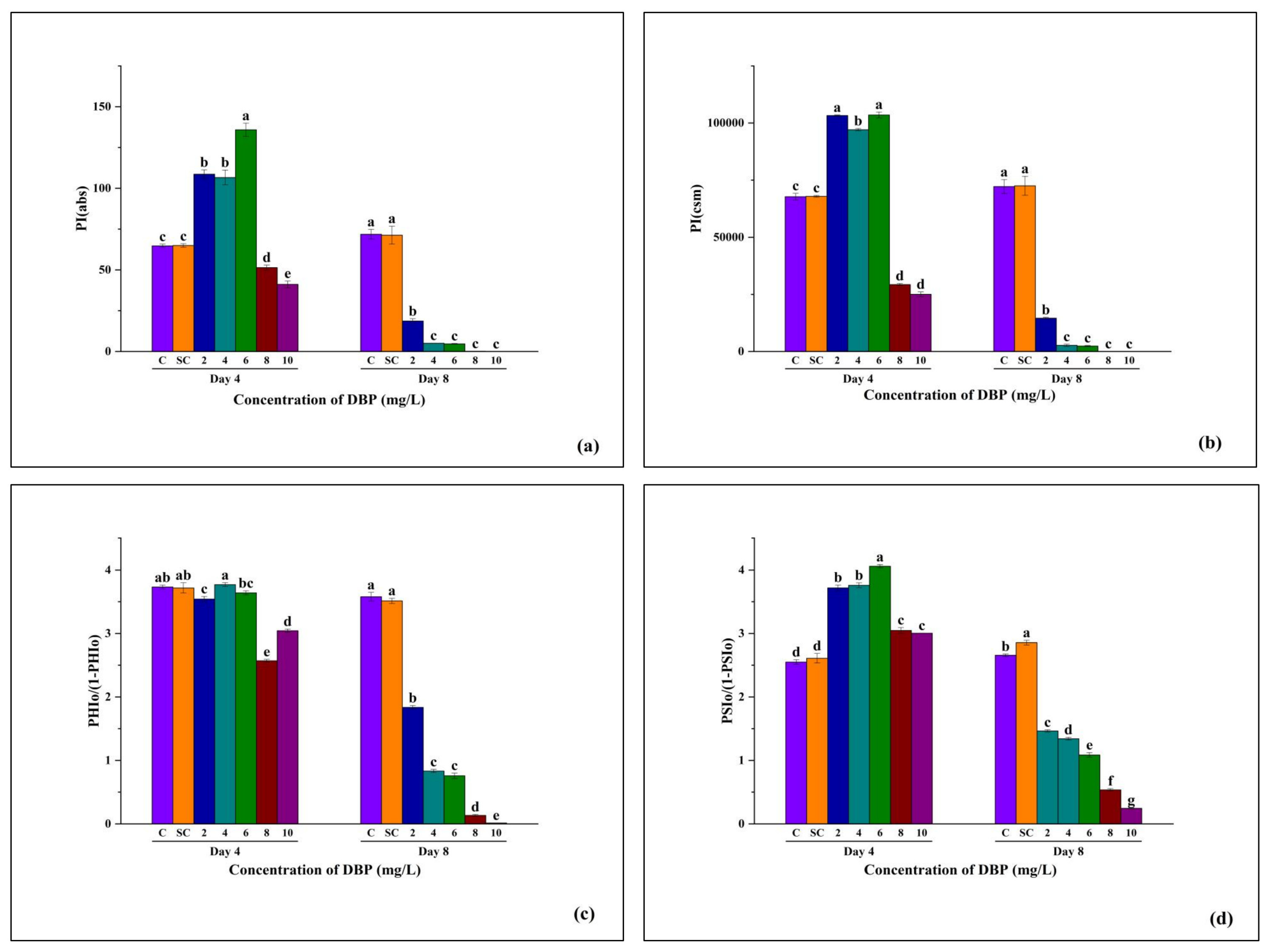 3.3.7. Photosynthetic Performance Indices and Primary and Secondary Photochemistry of A. pinnata Under DBP Exposure