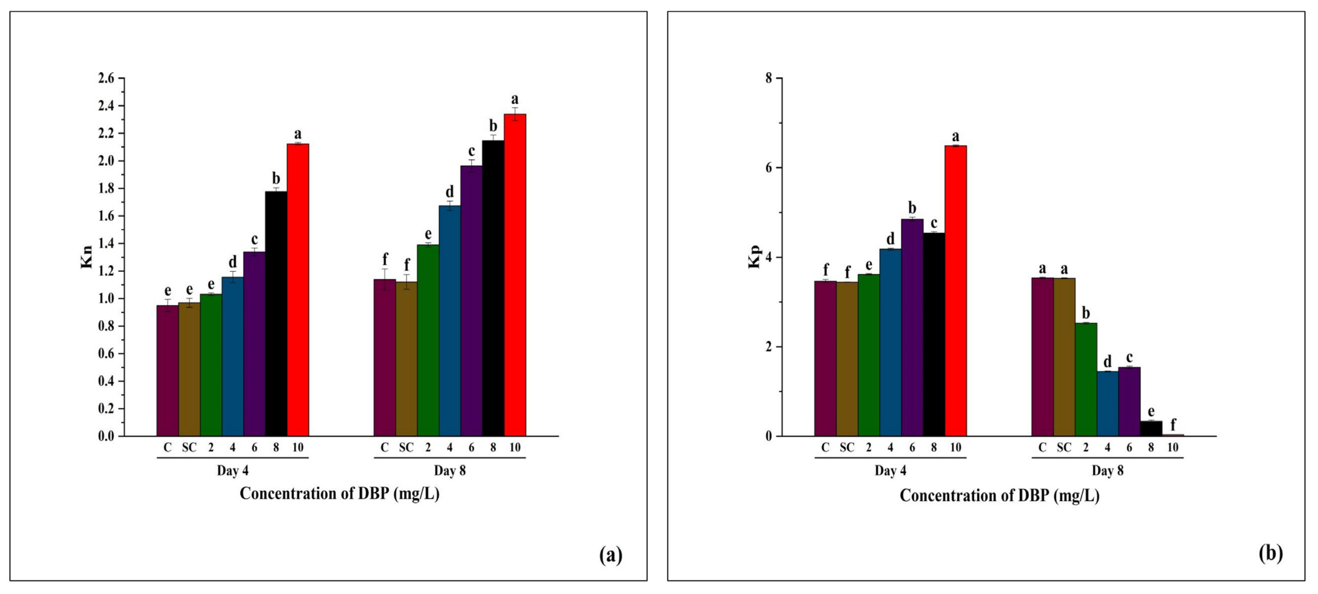 3.3.5. Changes in Kn and Kp of A. pinnata Under DBP Exposure