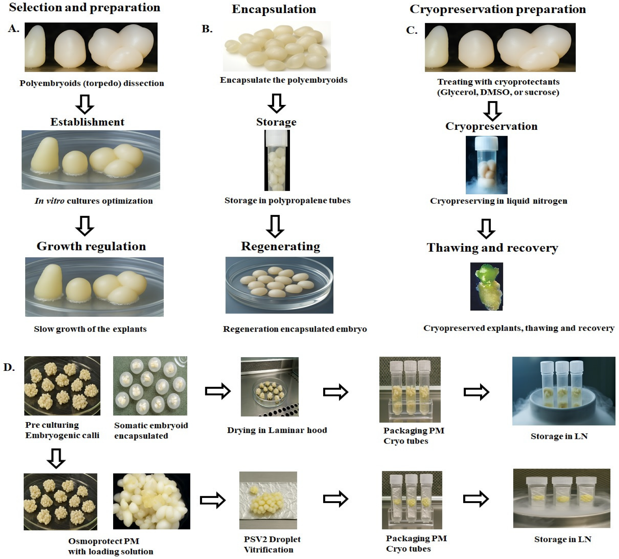 28]. Embryogenic calli containing polyembryoids are subjected to in vitro conservation through slow growth or cryogenic preservation (
