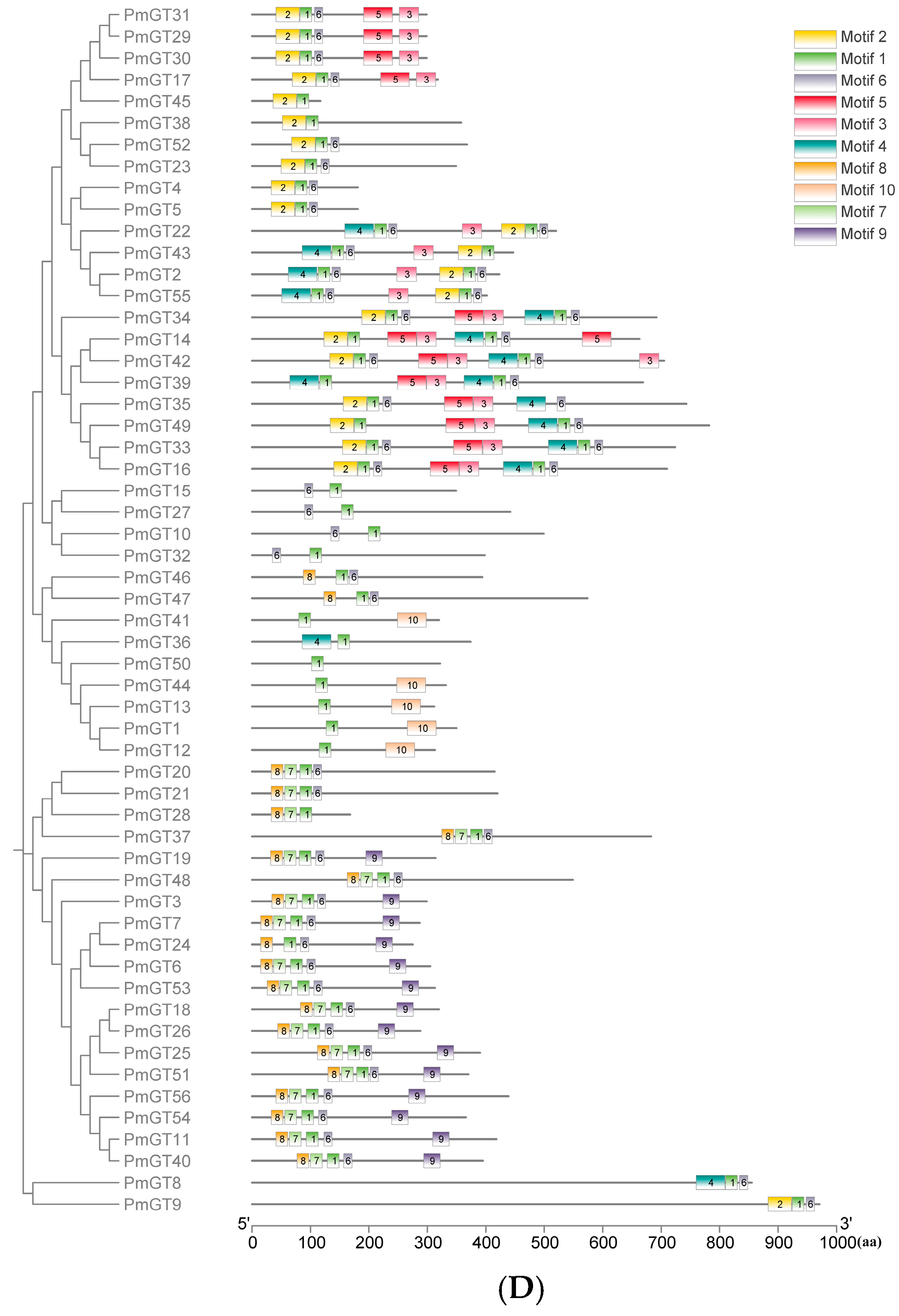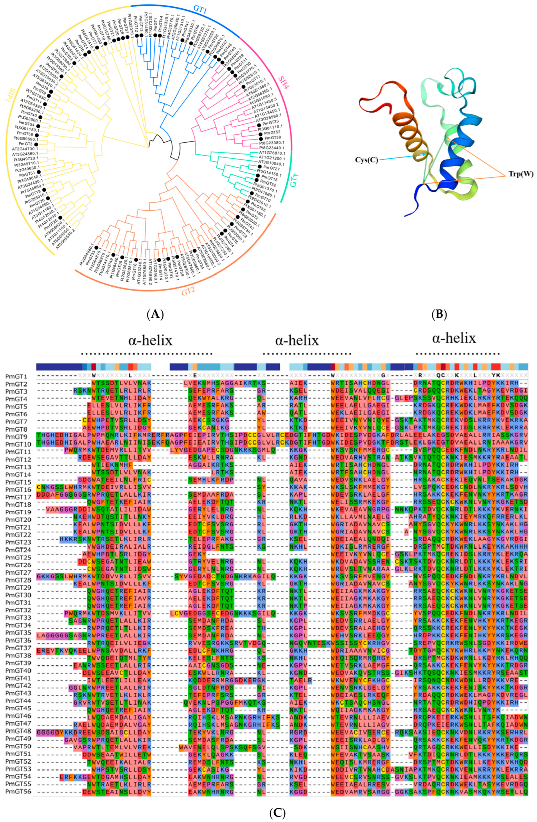 2.3. Phylogenetic and Protein Domain Analysis of PmGT Proteins