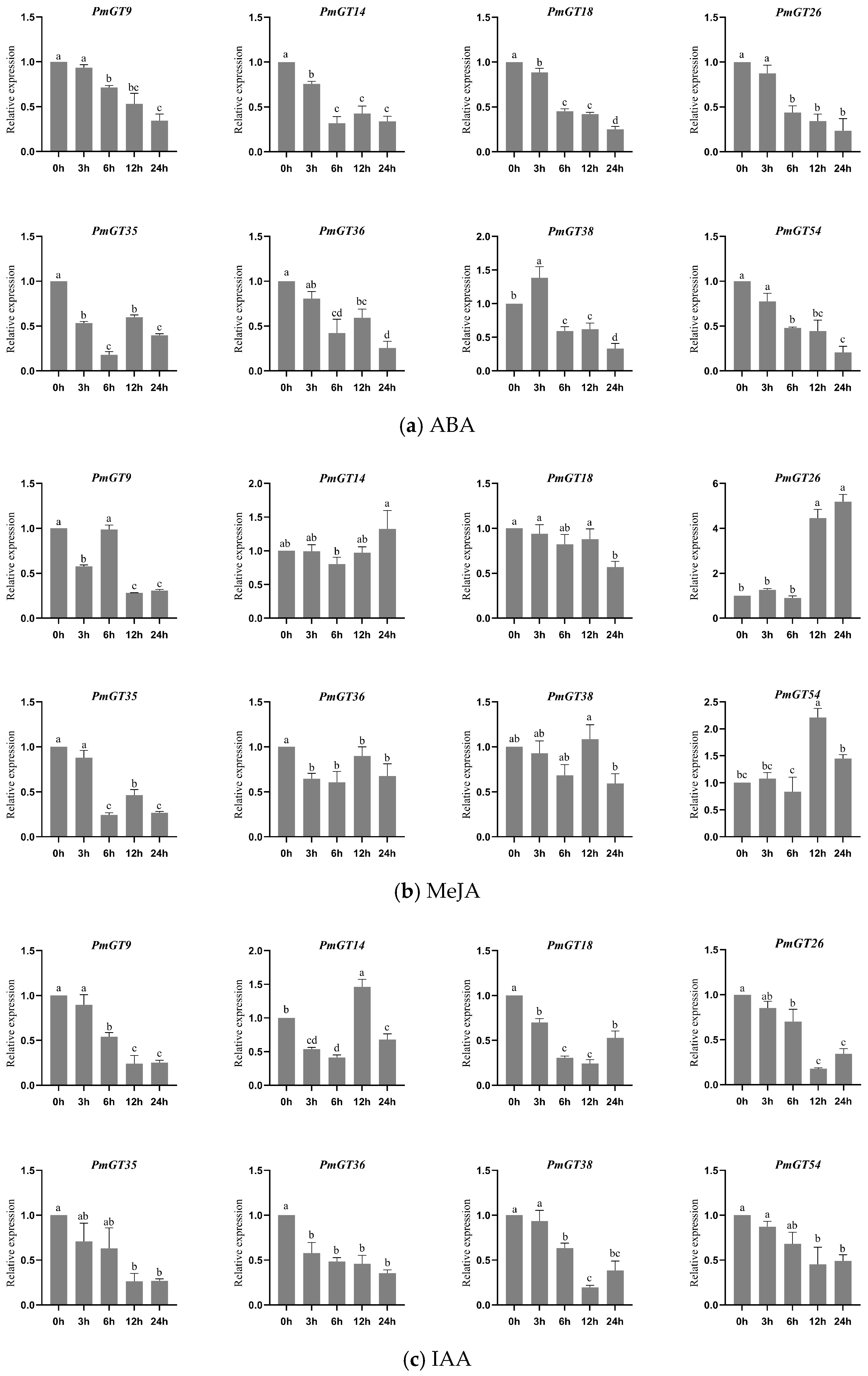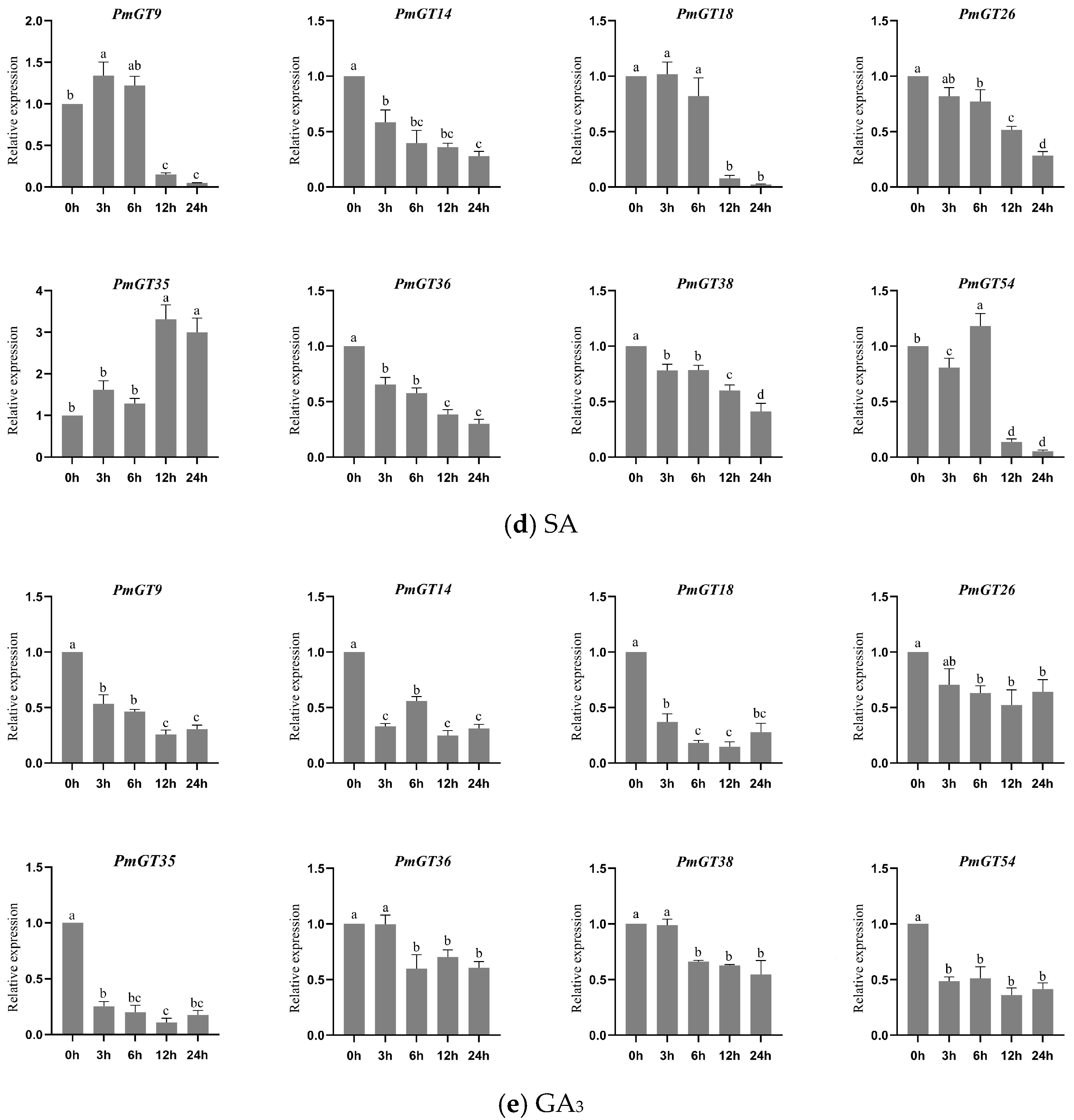 2.4. Cis-Regulatory Elements Analysis of the PmGTs Promoters