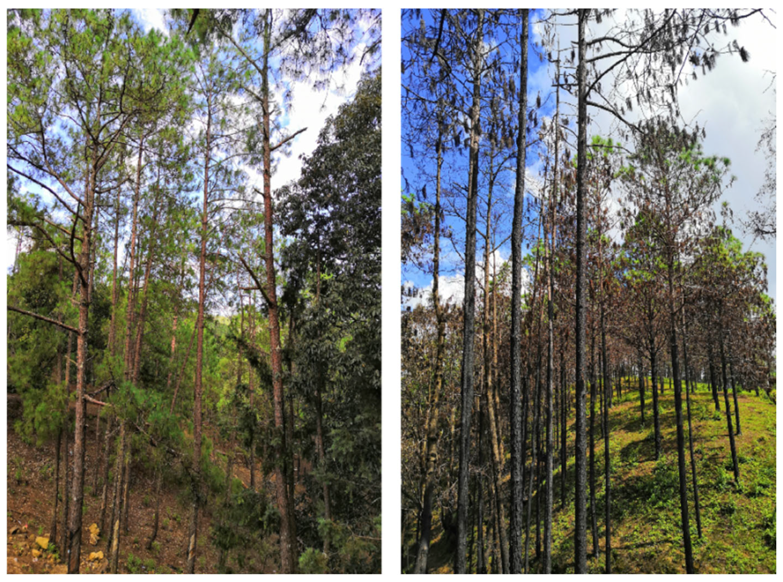 - Li, J.; Zhang, C.; Deng, Y.; Zhang, C.; Su, W.; Li, S. Spatial distribution pattern and association of Pinus yunnanensis forest formed by 40 years of fire disturbance in Jizu Mountain, Yunnan. Guihaia 2025, 45, 8. [Google Scholar]