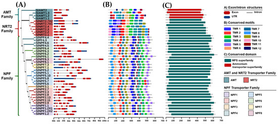 2.3. Analysis of Conserved Domain/Motif Analysis in SlNPF, SlNRT2 and SlAMT Proteins and Gene Structure Analysis of SlNPF, SlNRT2 and SlAMT Genes