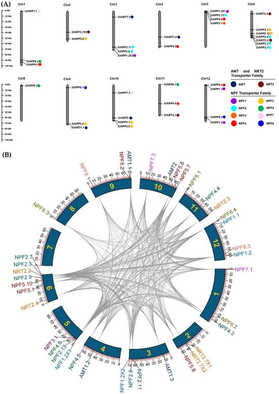 2.4. Chromosome Distribution and Evolutionary Duplication Analysis of SlNPF, SlNRT2 and SlAMT Genes in Tomato
