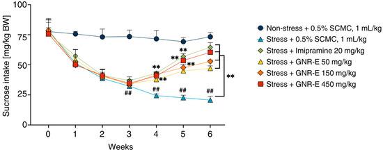 The effect of the GNR-E on anhedonia behavior in the sucrose preference test using CMS mice. The amount of 2% sucrose solution taken by each animal group was measured as an index of sucrose preference test once a week. Each data point represents the mean ± SEM (n = 12). ## p < 0.001 vs. the vehicle-treated non-stress group. ** p < 0.001 vs. the vehicle-treated CMS group (post hoc Tukey test).