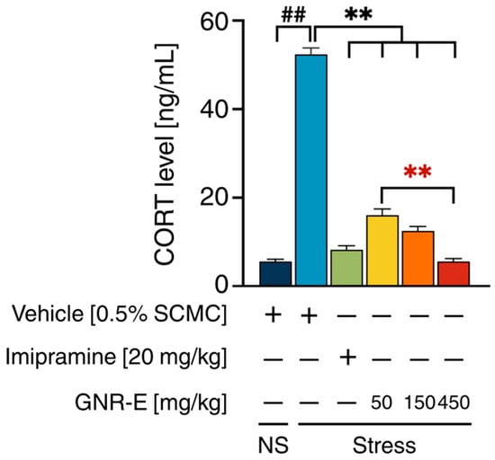 The effects of GNR-E and imipramine (IMP) on CMS-induced elevation of serum CORT levels. Each column represents the mean ± SEM (n = 6). ## p < 0.001 vs. the vehicle-treated non-stress group (NS). ** p < 0.001 vs. the vehicle-treated CMS group. ** p < 0.001, red asterisks indicate comparisons in different doses of GNR-E (post hoc Tukey test).