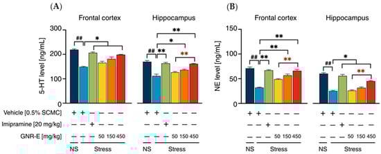 The effects of GNR-E and imipramine (IMP) on CMS-induced decrease in 5-HT (A) and NE (B) levels in the frontal cortex and hippocampus. Each data column represents the mean ± SEM (n = 6). ## p < 0.001 vs. the vehicle-treated non-stress group (NS). * p < 0.05 and ** p < 0.001 vs. the vehicle-treated CMS group. ** p < 0.001, red asterisks indicate comparisons in different doses of GNR-E (post hoc Tukey test).