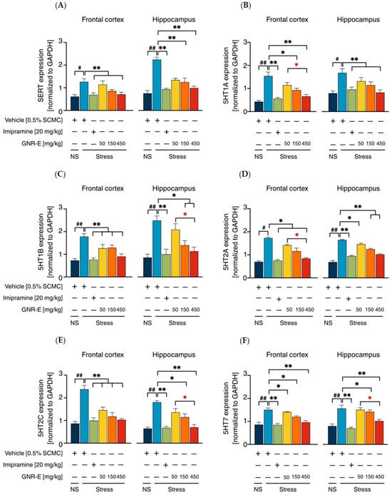 Effects of GNR-E and imipramine (IMP) on CMS-induced changes in expression levels of genes encoding SERT (A), 5HT1A (B), 5HT1B (C), 5HT2A (D), 5HT2C (E), and 5HT7 (F) in the frontal cortex and hippocampus. Each column represents the mean ± SEM (n = 6). # p < 0.05, ## p < 0.001 vs. the vehicle-treated non-stress group (NS). * p < 0.05, ** p < 0.001 vs. the vehicle-treated CMS group. * p < 0.05, red asterisks indicate comparisons in different doses of GNR-E (post hoc Tukey test).
