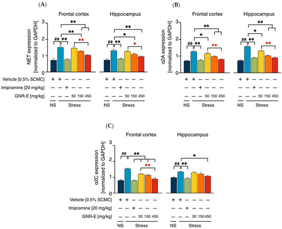 Effects of daily administration of GNR-E and imipramine (IMP) on CMS-induced changes expression levels of genes encoding NET (A), α2A (B), and α2C (C) in the frontal cortex and hippocampus. Each column represents the mean ± SEM (n = 6). ## p < 0.001 vs. the vehicle-treated non-stress group (NS). * p < 0.05, ** p < 0.001 vs. the vehicle-treated CMS group. * p < 0.05, ** p < 0.001 red asterisks indicate comparisons in different doses of GNR-E (post hoc Tukey test).
