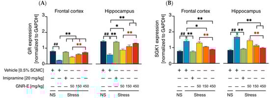 Effects of daily GNR-E and imipramine (IMP) administrations on CMS-induced changes in expression levels of genes encoding glucocorticoid receptor (GR) (A) and glucocorticoid-inducible kinase-1 (SGK-1) (B) in the frontal cortex and hippocampus. Each column represents the mean ± SEM (n = 6). ## p < 0.001 vs. the vehicle-treated non-stress group (NS). * p < 0.05, ** p < 0.001 vs. the vehicle-treated CMS group. ** p < 0.001, red asterisks indicate comparisons in different doses of GNR-E (post hoc Tukey test).