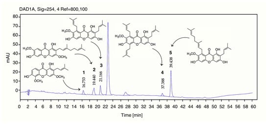 Chromatographic profile of GNR-E. Peaks corresponds to cowagarcinone C (1), cowaxanthone (2), α-mangostin (3), 7-O-methylgarcinone E (4), and cowanin (5) of GNR-E.