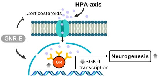 Schematic illustration showing the modulation of the hypothalamic–pituitary–adrenal (HPA) axis components in response to GNR-E treatment. GNR-E attenuates corticosterone-induced overactivation of glucocorticoid receptor (GR) signaling and downregulates SGK-1 transcription, contributing to restored neurogenesis. Abbreviations: GR, glucocorticoid receptor; SGK-1, serum/glucocorticoid-regulated kinase 1; HPA-axis, hypothalamic–pituitary–adrenal axis. Sample size: n = 6 per group for serum corticosterone and mRNA expression analysis. Scale bar: not applicable (schematic illustration).