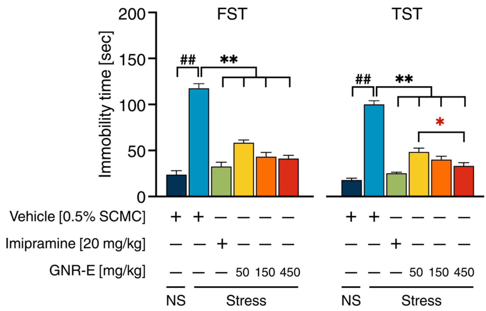 2.3. Effect of GNR-E on CMS-Induced Learned Helplessness Behavior in Forced Swimming Test and Tail Suspension Test