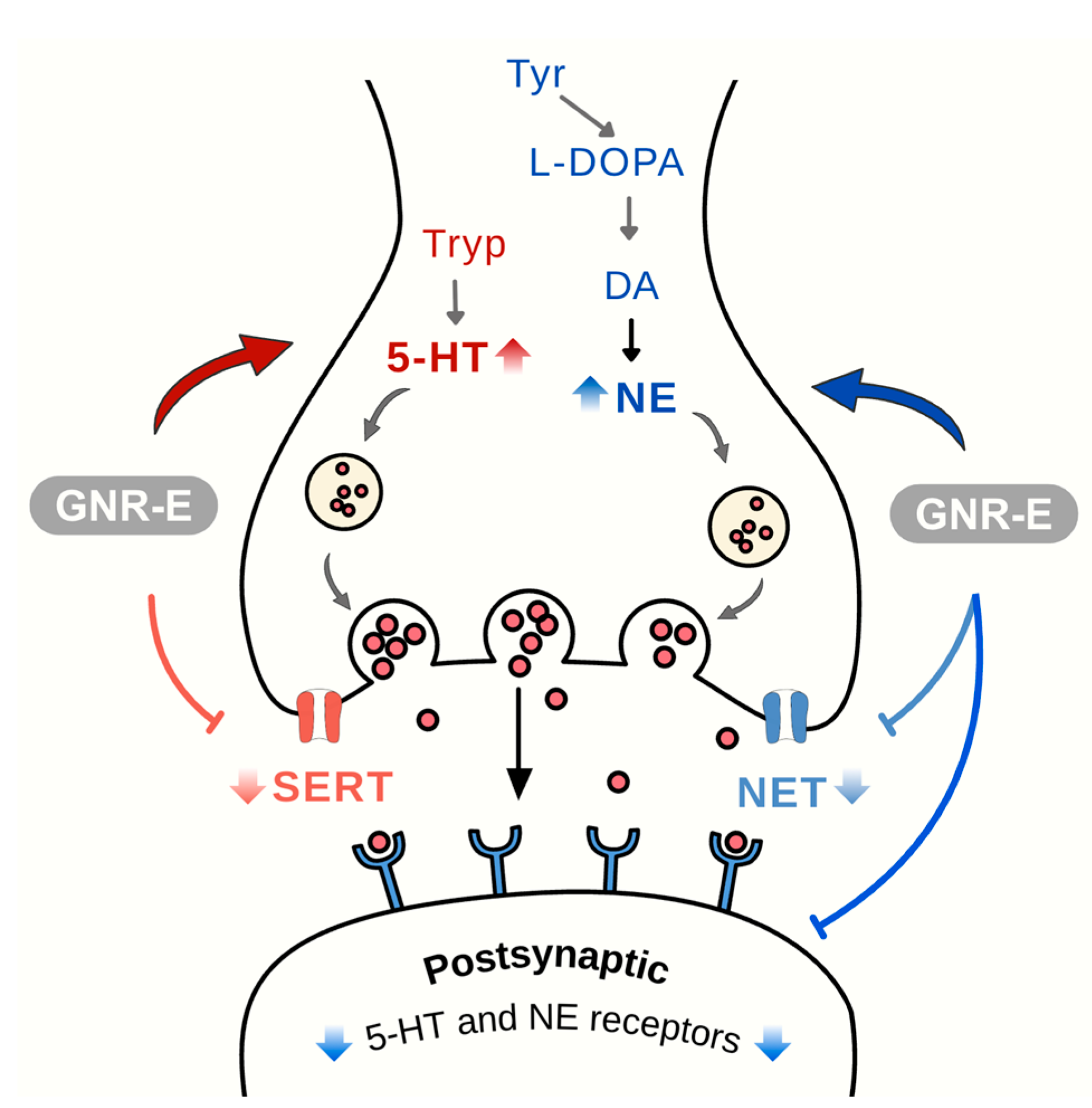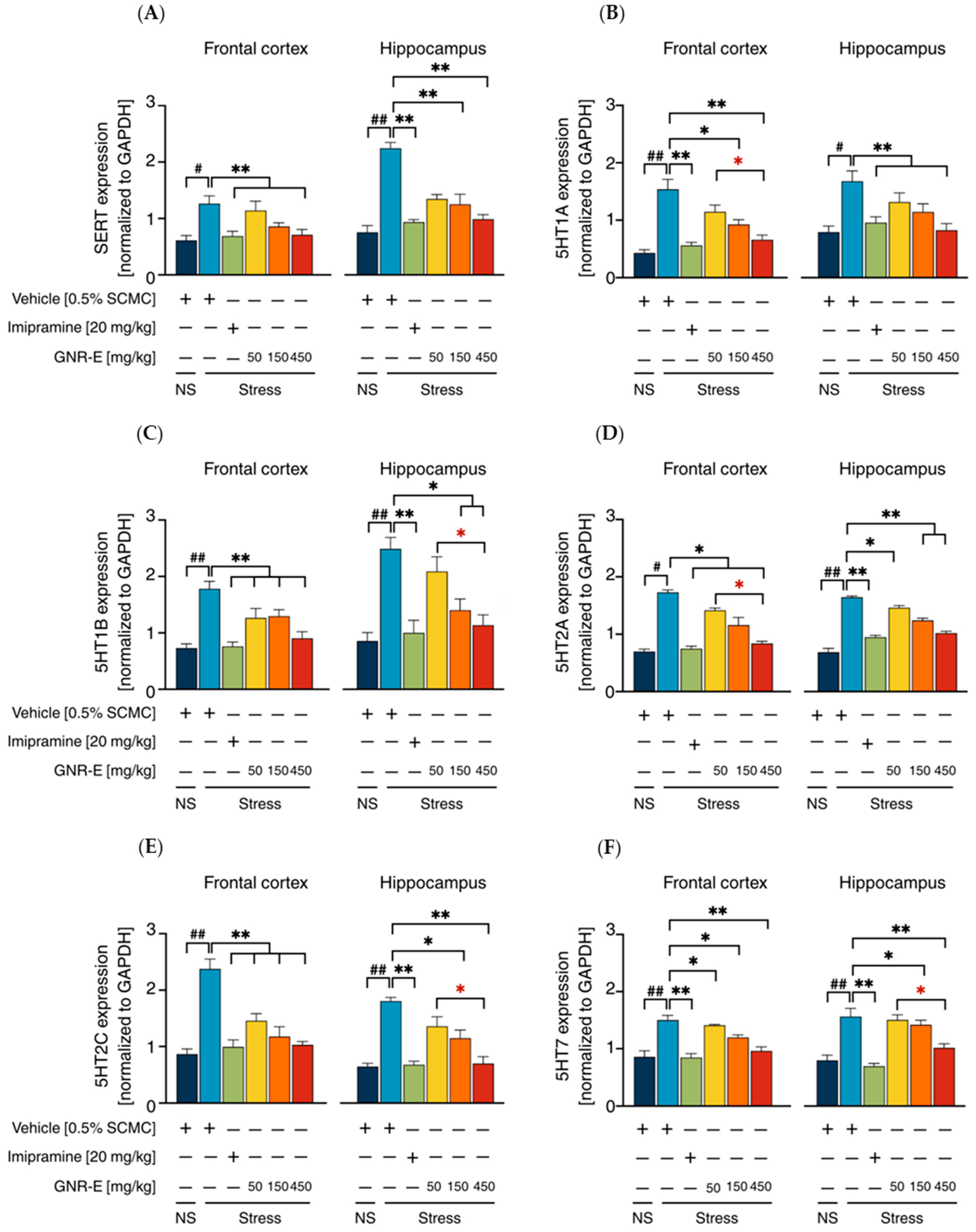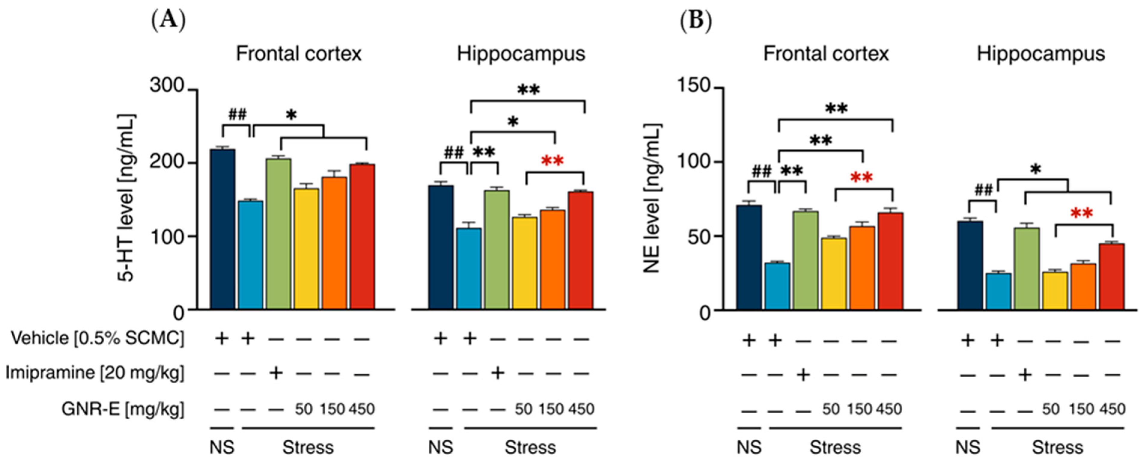 2.5. Effect of GNR-E on CMS-Induced Decrease in 5-HT and NE Levels