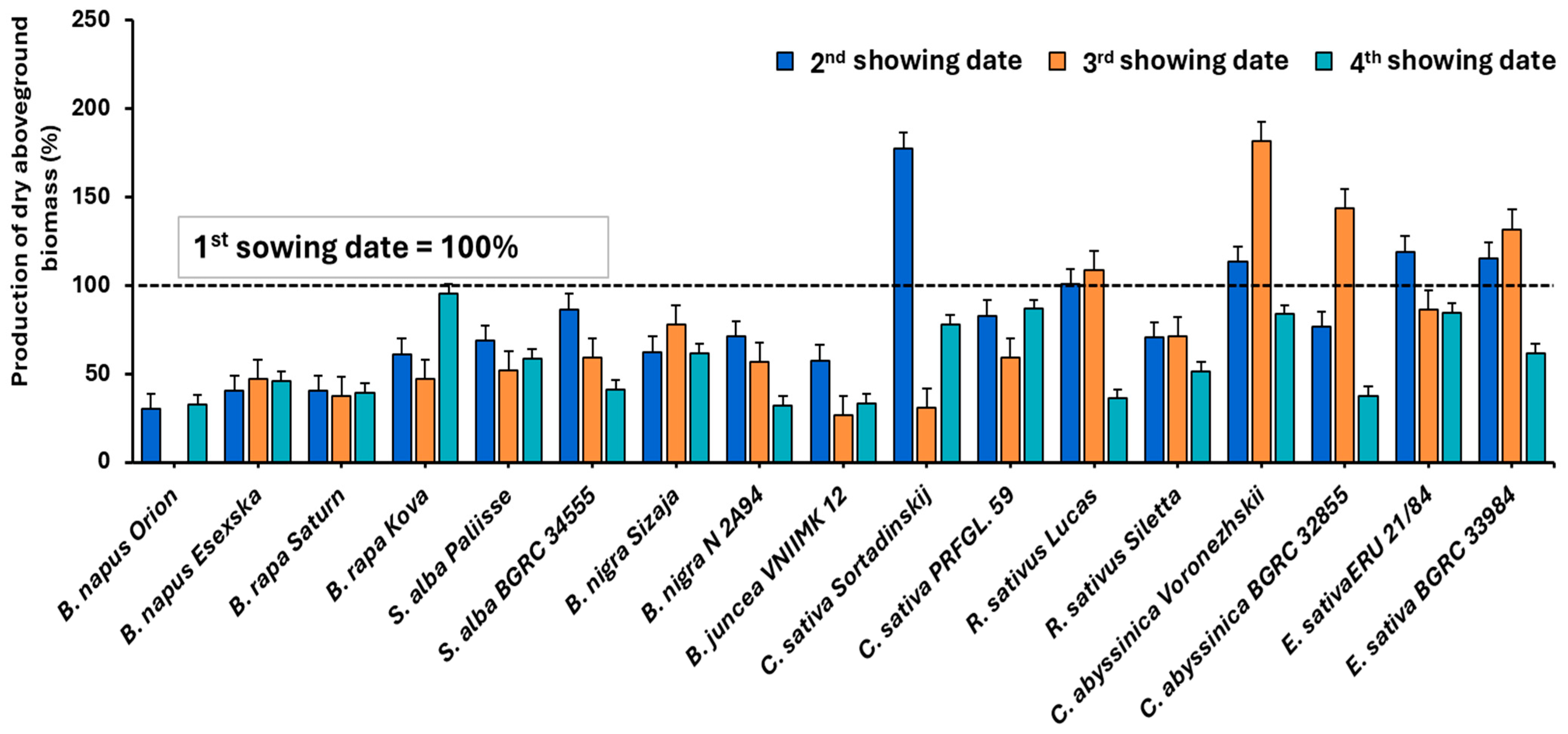Brant V, Rychlá A, Hamouzová K, Vrbovský V, Procházka P, Chára J, Holejšovský J, Piskáčková T, Bhattacharya S, Dreksler J. The Effect of Sowing Date on the Biomass Production of Non-Traditional and Commonly Used Intercrops from the Brassicaceae Family. Plants. 2025; 14(23):3654. https://doi.org/10.3390/plants14233654