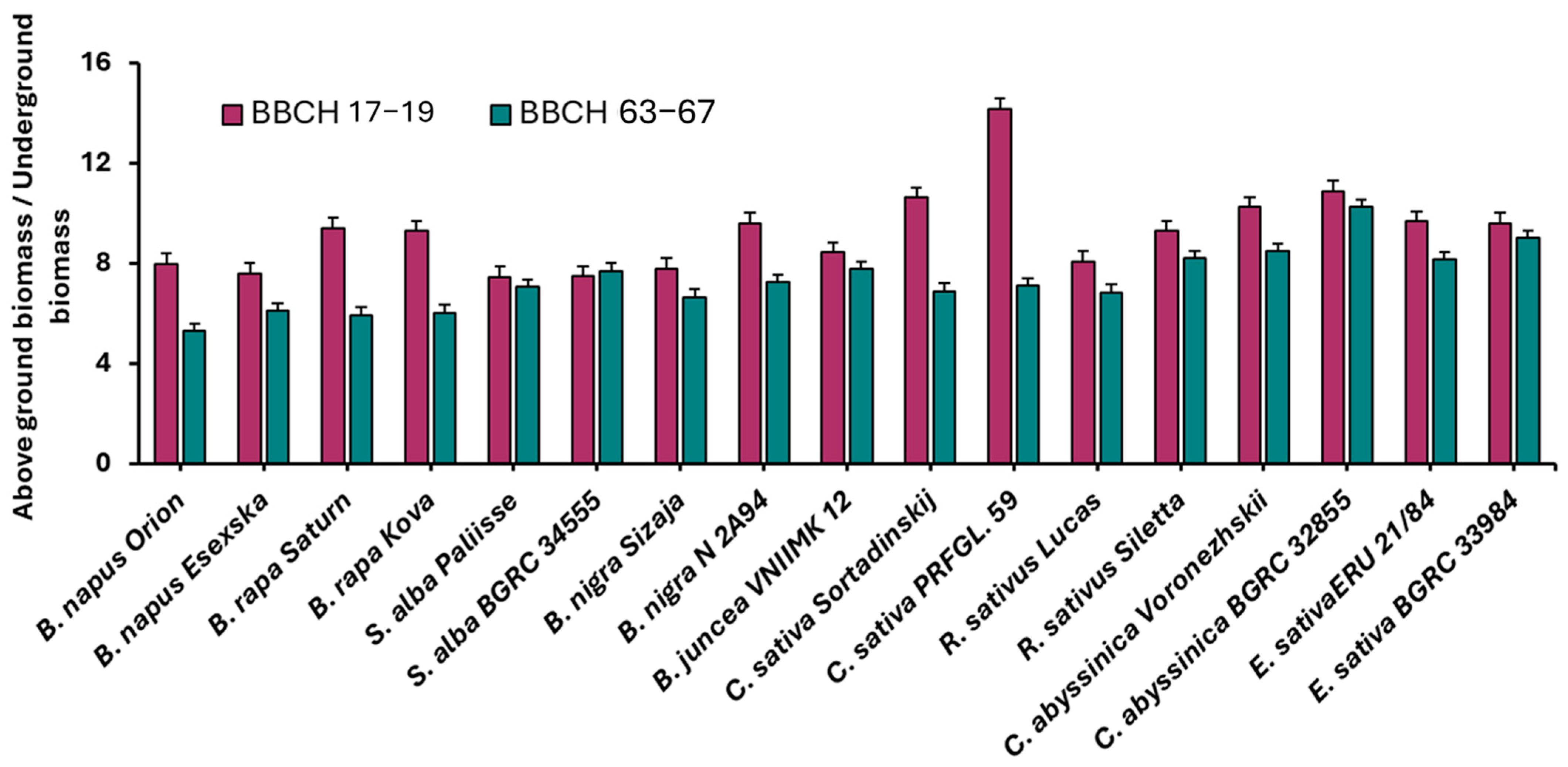 | B. juncea | VNIIMK 12 | 8.9 | a | 5.2 | abc | 10.2 | ab | 9.4 | abcd | 6.0 | abc | 6.9 | bcd | 14.0 | ab | 4.2 | ab |