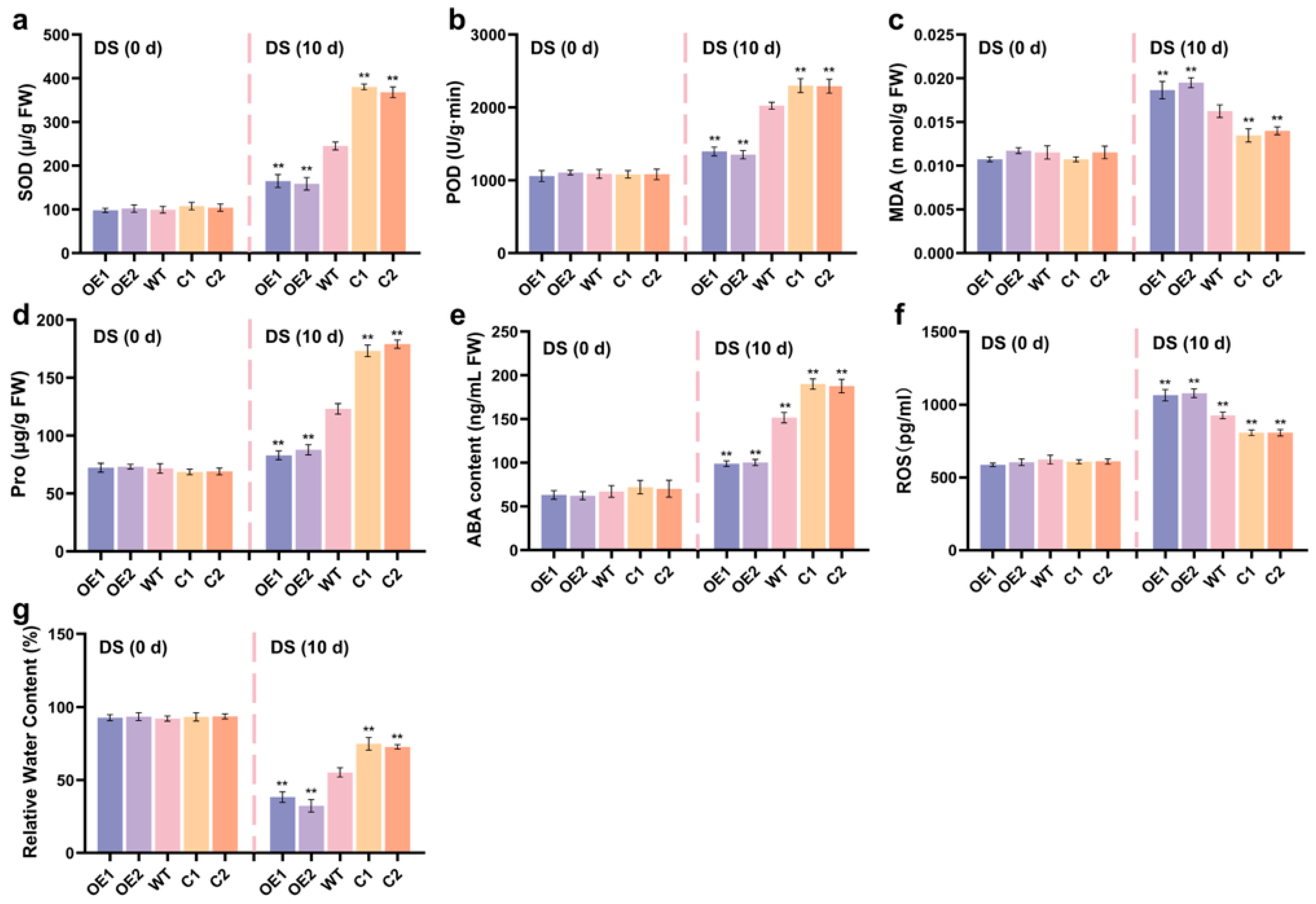 2.5. ZmCaM2 Decreases Maize Drought Tolerance by Affecting Antioxidant Enzyme Activity