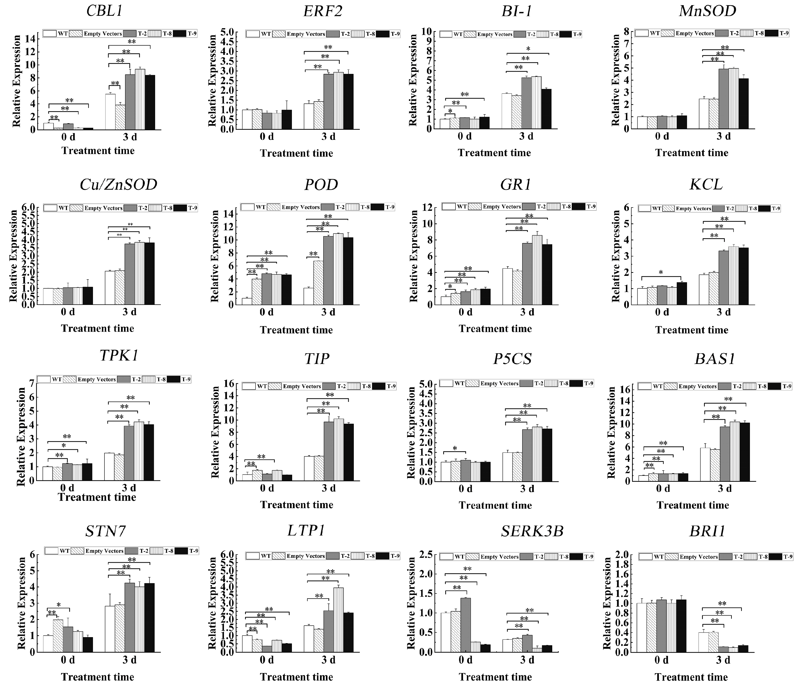2.6. Expression of Stress-Responsive Genes in Transgenic Tobacco