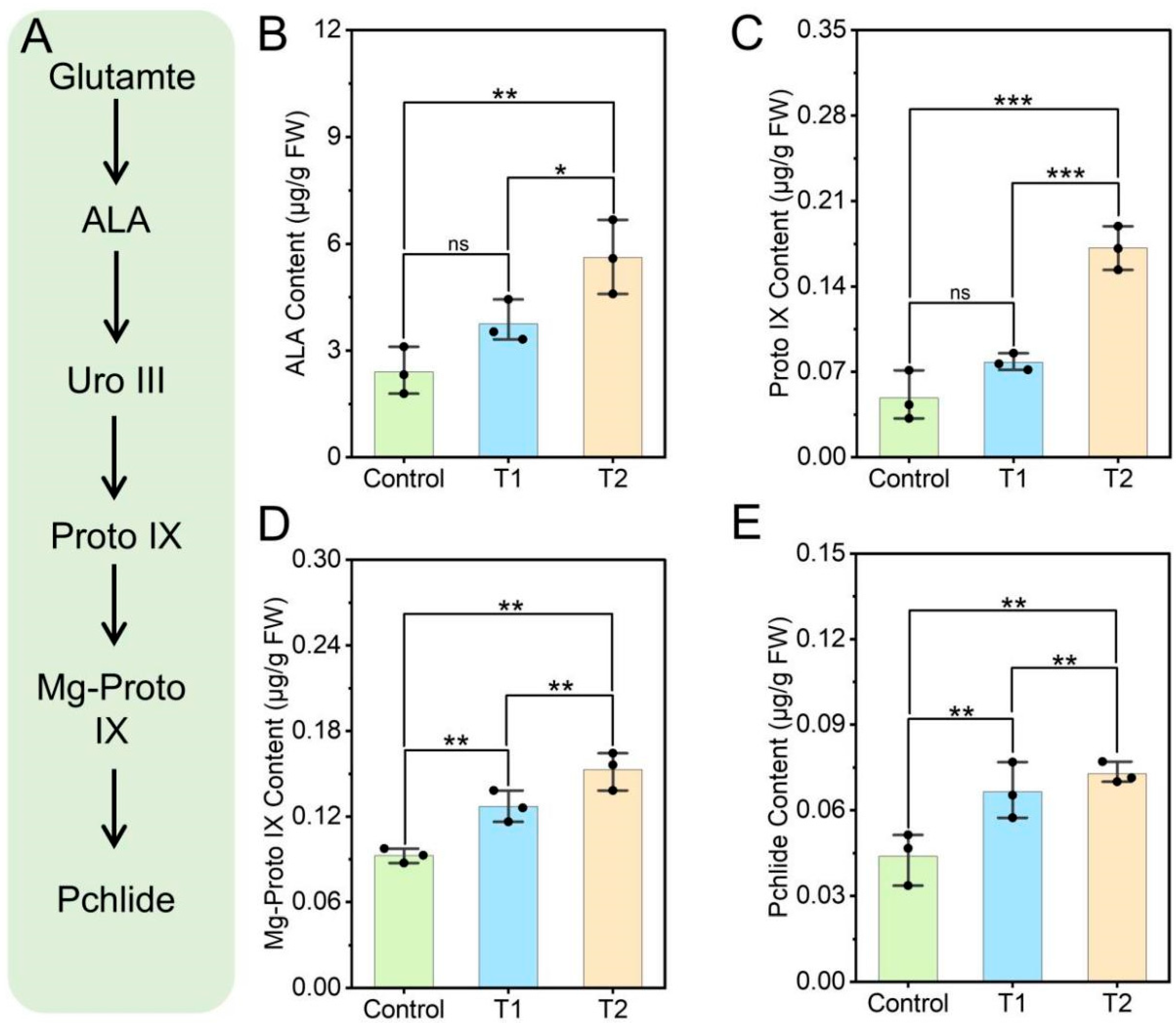 - Wu, Y.; Jin, X.; Liao, W.; Hu, L.; Dawuda, M.M.; Zhao, X.; Tang, Z.; Gong, T.; Yu, J. 5-Aminolevulinic Acid (ALA) Alleviated Salinity Stress in Cucumber Seedlings by Enhancing Chlorophyll Synthesis Pathway. Front. Plant Sci. 2018, 9, 635. [Google Scholar] [CrossRef]