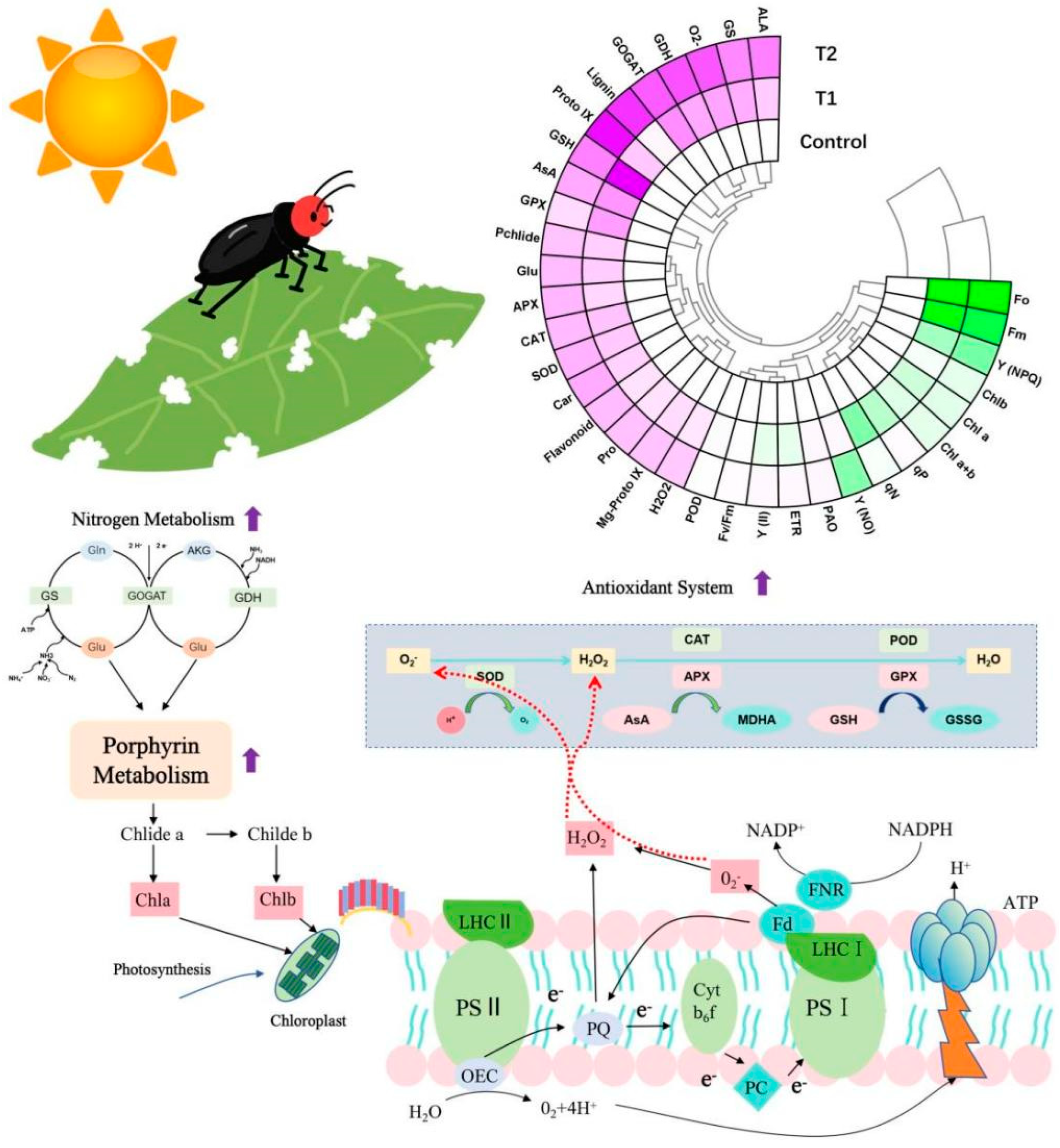 Wang, F.; Lv, Z.; Xiao, L.; Chen, B.; Liu, W.; Huang, J.; Liu, G.; Yan, Y.; Huang, J.; Yang, G. Physiological Responses of Paulownia fortunei to Leaf Herbivory by Epicauta ruficeps: Nitrogen Assimilation, Porphyrin Metabolism, and ROS-Driven Antioxidant and Phenylpropanoid Responses. Plants 2025, 14, 3659. https://doi.org/10.3390/plants14233659