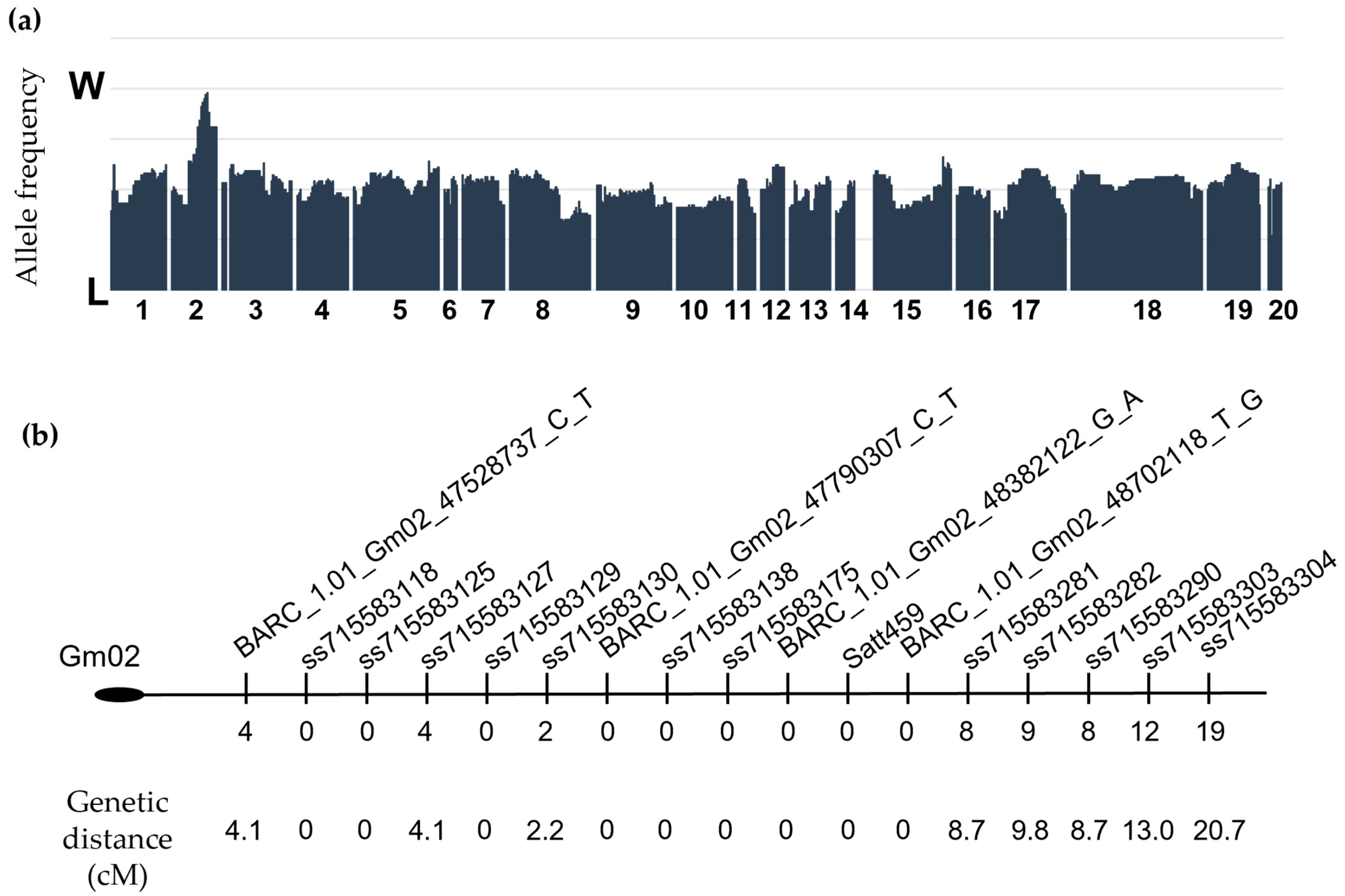 - Song, Q.J.; Marek, L.F.; Shoemaker, R.C.; Lark, K.G.; Concibido, V.C.; Delannay, X.; Specht, J.E.; Cregan, P.B. A New Integrated Genetic Linkage Map of the Soybean. Theor. Appl. Genet. 2004, 109, 122–128. [Google Scholar] [CrossRef]