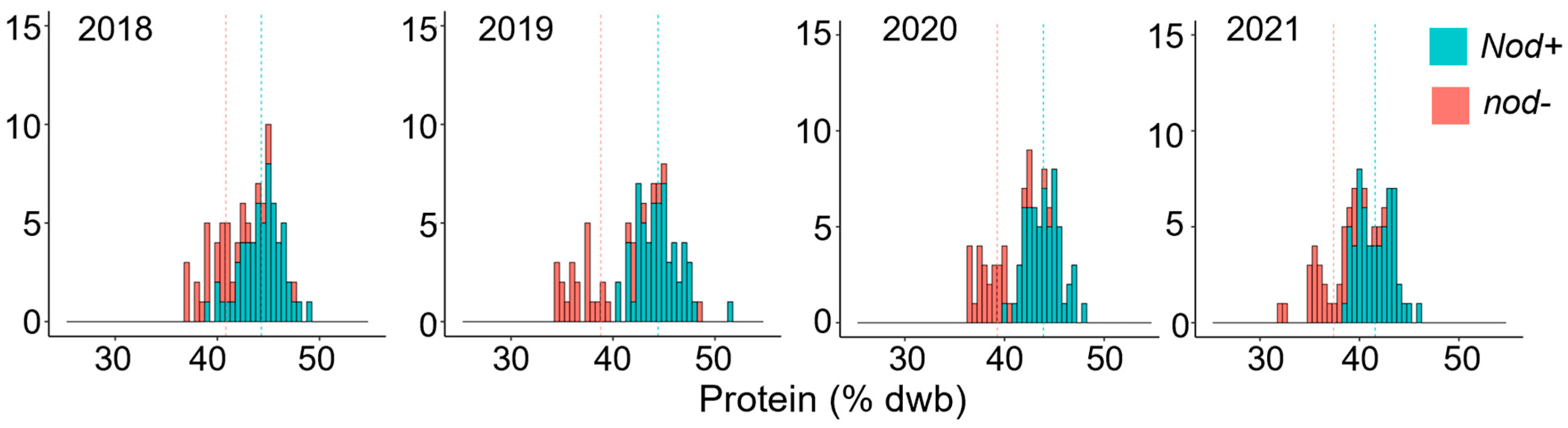 - Weber, C.R. Nodulating and Nonnodulating Soybean Isolines: I. Agronomic and Chemical Attributes1. Agron. J. 1966, 58, 43–46. [Google Scholar] [CrossRef]