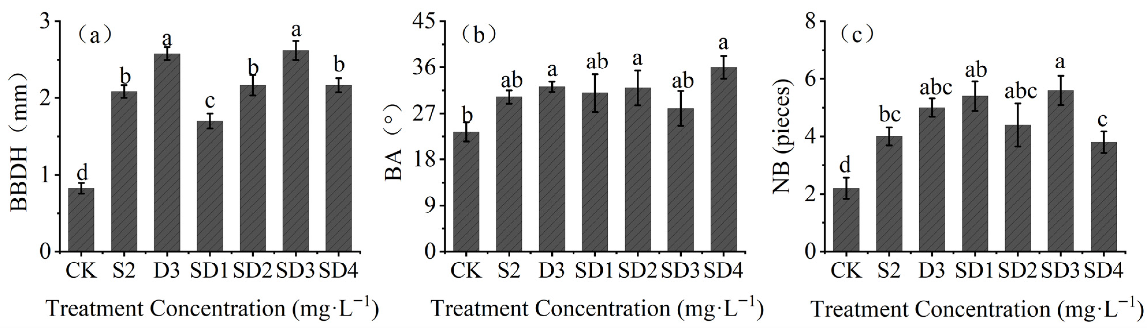 | BDH (mm) | CK | 0.28 ± 0.02 d | 0.19 ± 0.02 d | 0.13 ± 0.02 c | 0.09 ± 0.009 c | 0.05 ± 0.007 b | 0.02 ± 0.006 a |