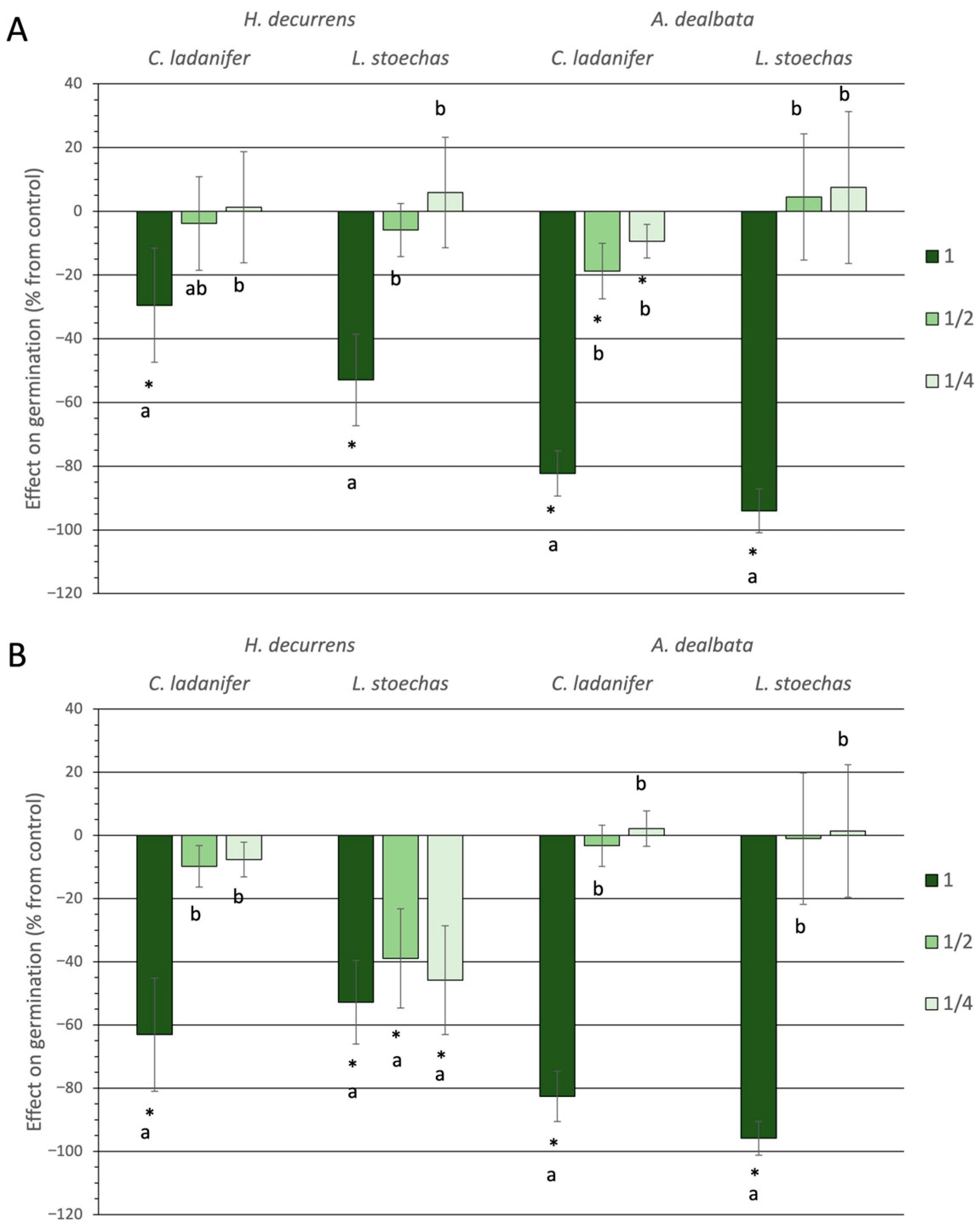 2.1. Allelopathic Effect of Aqueous Extracts from Invasive Species on Native Mediterranean Species