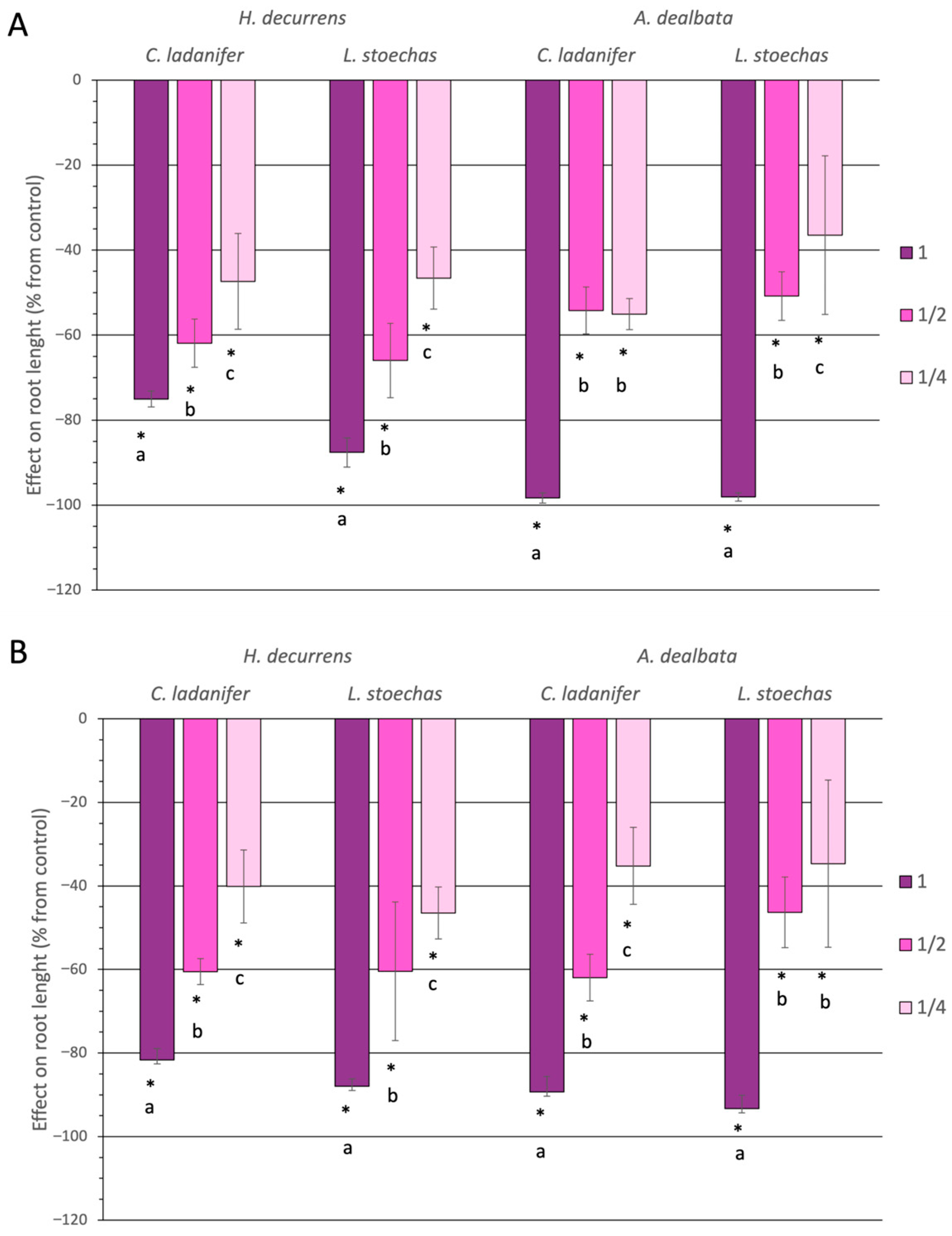 - Root length relative to control (%LR): Average root length expressed as a percentage of the control, calculated as: