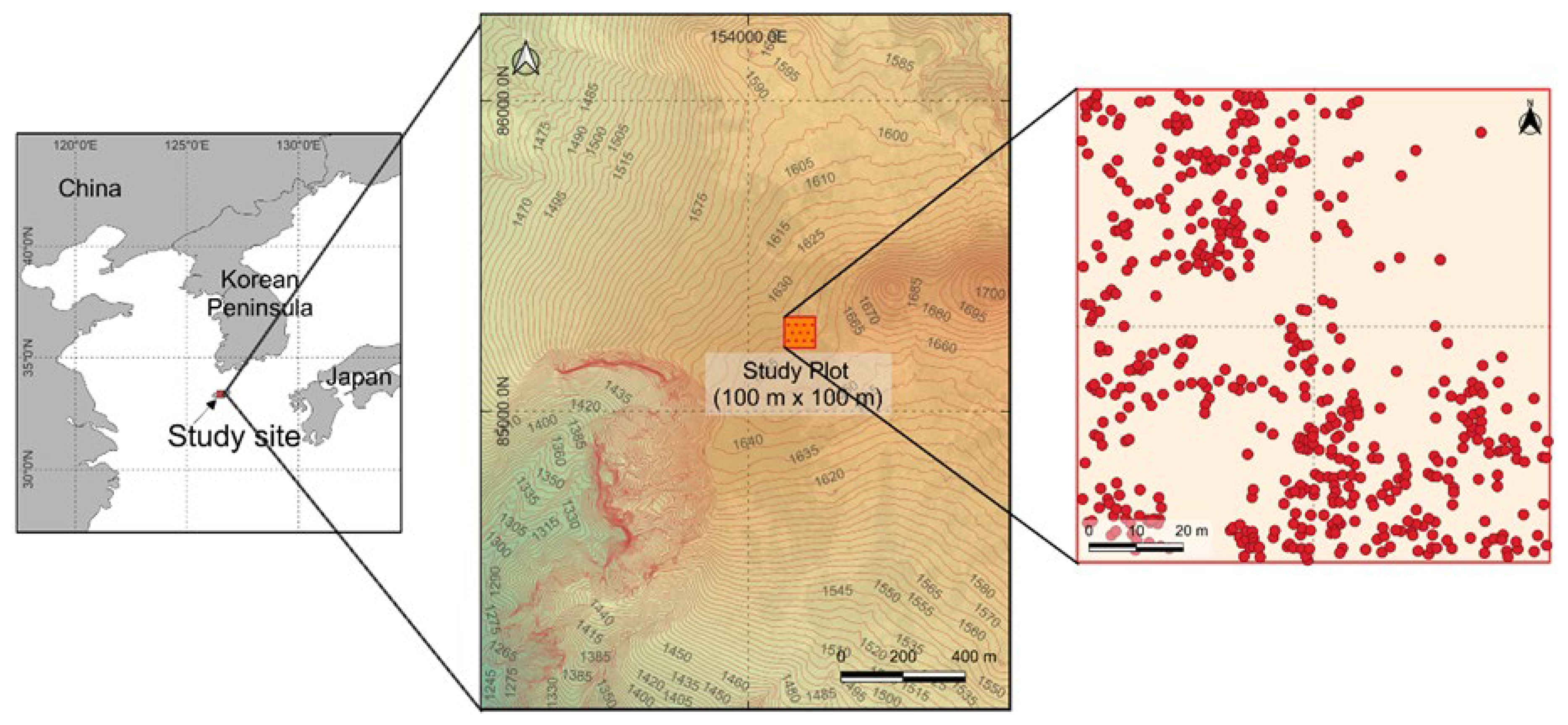 A 1-hectare permanent plot (100 m × 100 m) was established on the west slope of Mt. Hallasan, Jeju Island (