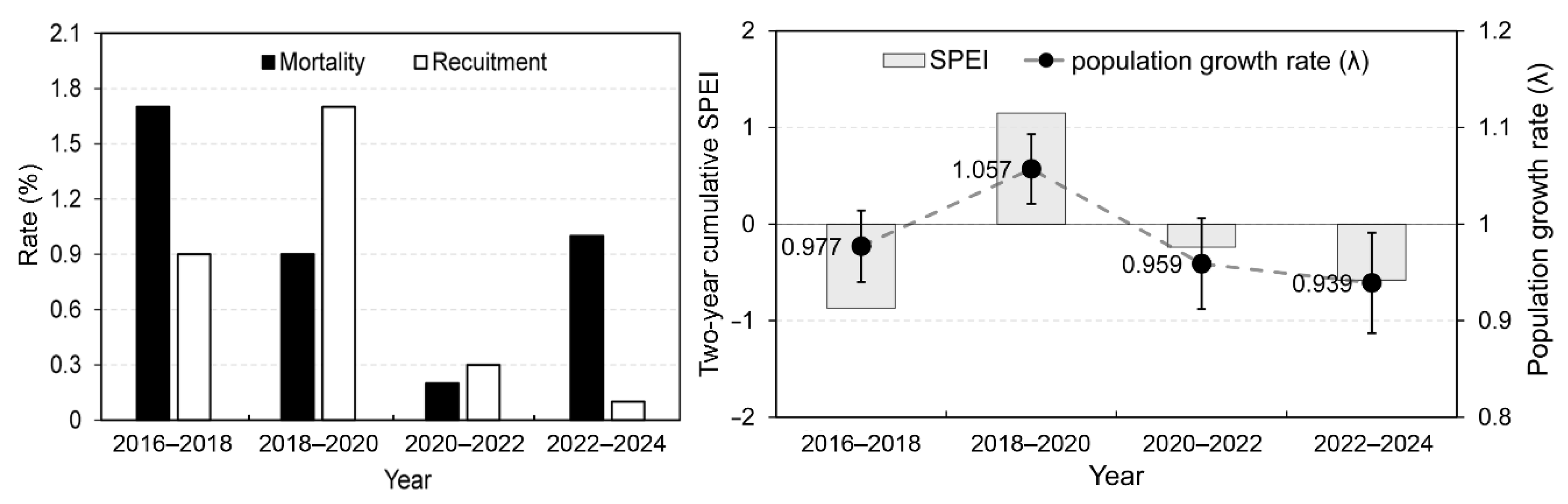 Figure 2 highlights a significant shift in demographic trends during survey periods. During 2018–2020, the recruitment rate was nearly double the mortality rate. This positive balance resulted in the highest population growth rate, λ = 1.057 (SD = 0.036). Indicating a substantial population expansion. In contrast, during 2022–2024, the recruitment dramatically decreased to its lowest point (0.1%), while mortality remained relatively high (1%), which led to the lowest population growth rate of the entire survey period, λ = 0.939 (SD = 0.052), signifying the sharpest population decline. Two-year cumulative SPEI values were positive only in 2018–2020, suggesting an absence of drought during this interval, in contrast to the other periods, which were characterized by negative SPEI and thus relatively drier conditions.