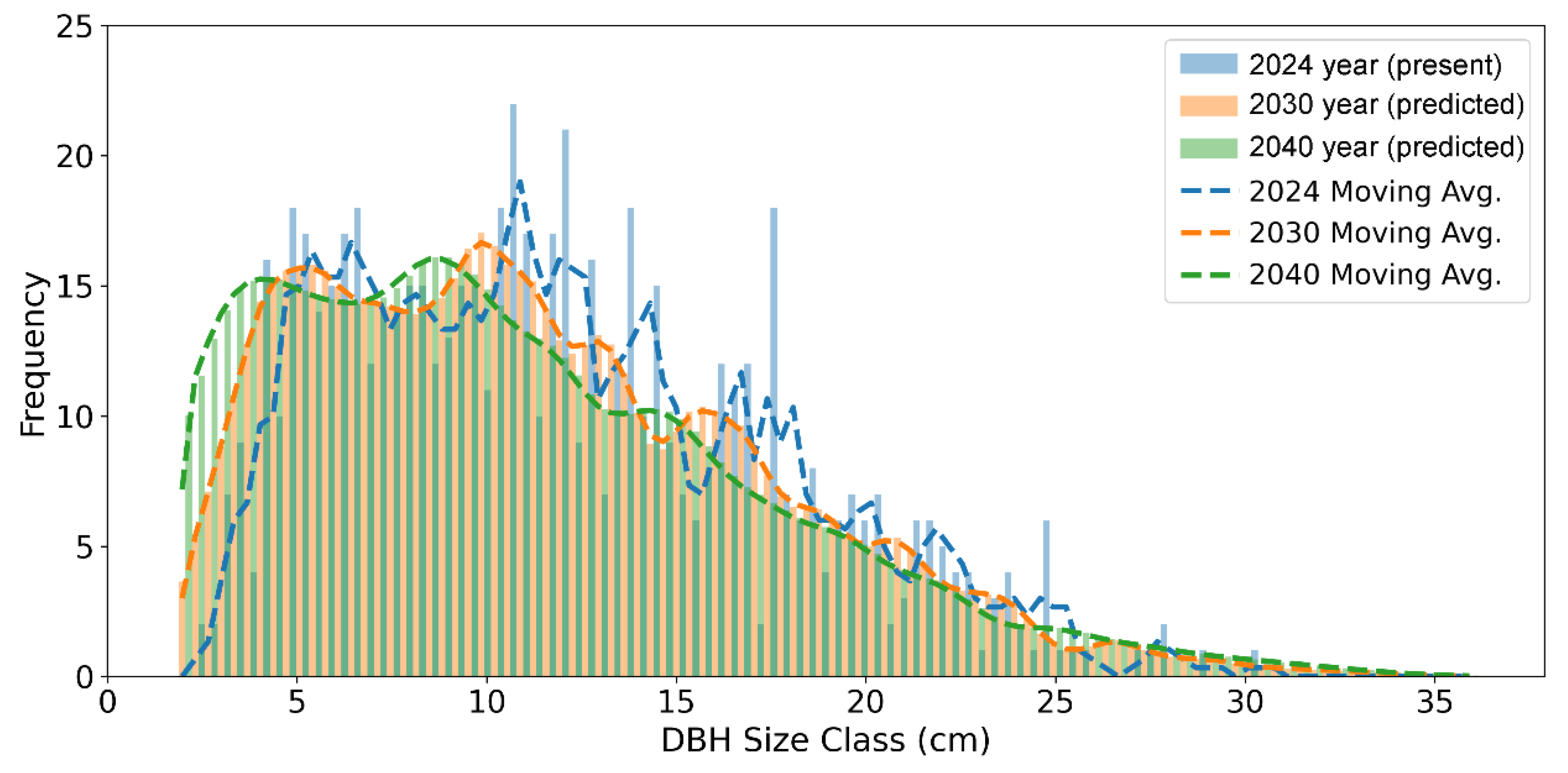 Figure 3). The frequency of small individuals (2.5 cm ≤ DBH ≤ 5 cm) is projected to gradually increase by 2030 and 2040. This accumulation likely reflects the combined effects of continuous recruitment into the small-sized class, relatively high survival rates—contrary to previous findings [