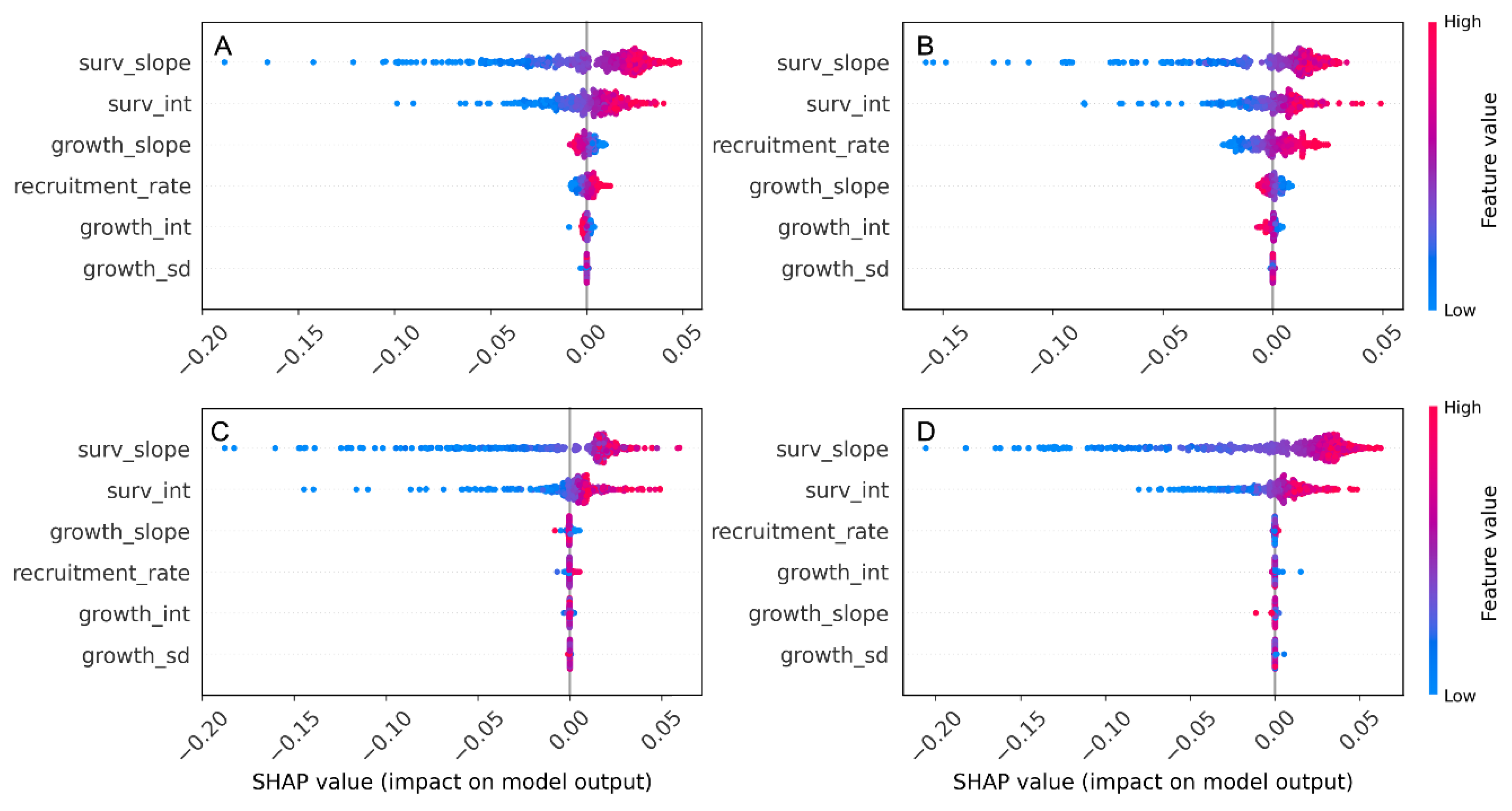 The SHAP summary plots showed a clear hierarchy in parameter importance, with the survival intercept and slope having the largest absolute SHAP values across all four census intervals, indicating that uncertainty in survival parameters contributed most strongly to variation in population growth rate (λ