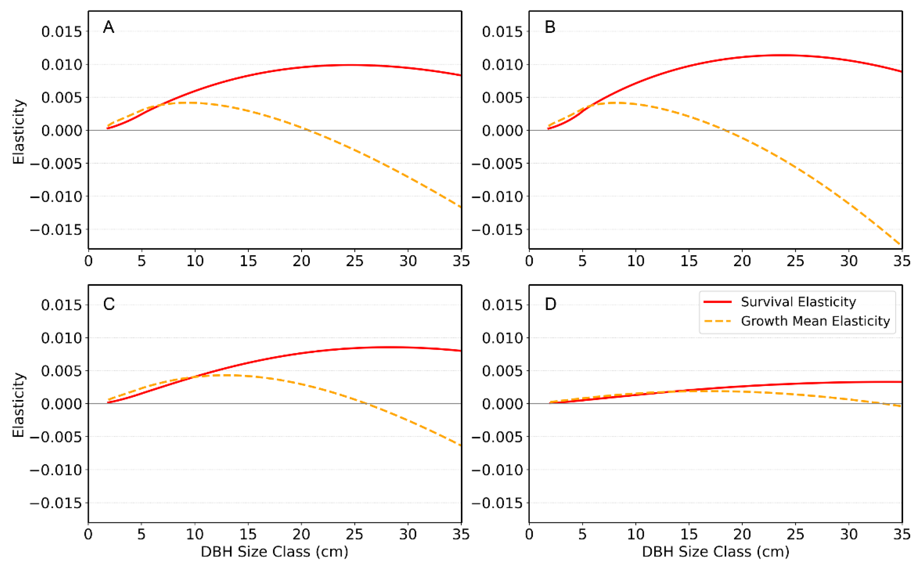 Figure 5). The red curves show survival elasticity, which consistently peaks at intermediate DBH classes where changes in survival have the greatest effect on λ. The orange dashed curves show elasticity of the mean growth transition: growth of small–medium trees has a weak positive effect on λ, whereas growth of large trees has a negative elasticity, indicating that further increases in their size reduce population growth.