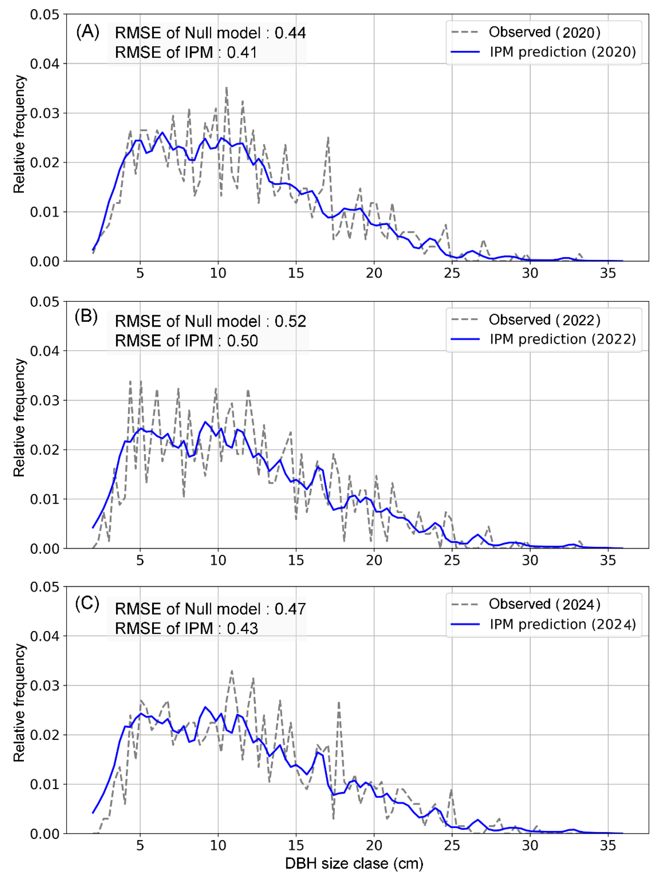 1]. Furthermore, we successfully demonstrated the IPM’s robustness by utilizing only the readily available field-observed recruitment rate and implementing a novel approach to estimate the Fecundity (F) kernel, decomposing the process into the size distribution of new recruits and the size-dependent reproductive output of mature individuals, which is demonstrated by improvement of the prediction performance comparing IPM model results and Null model (
