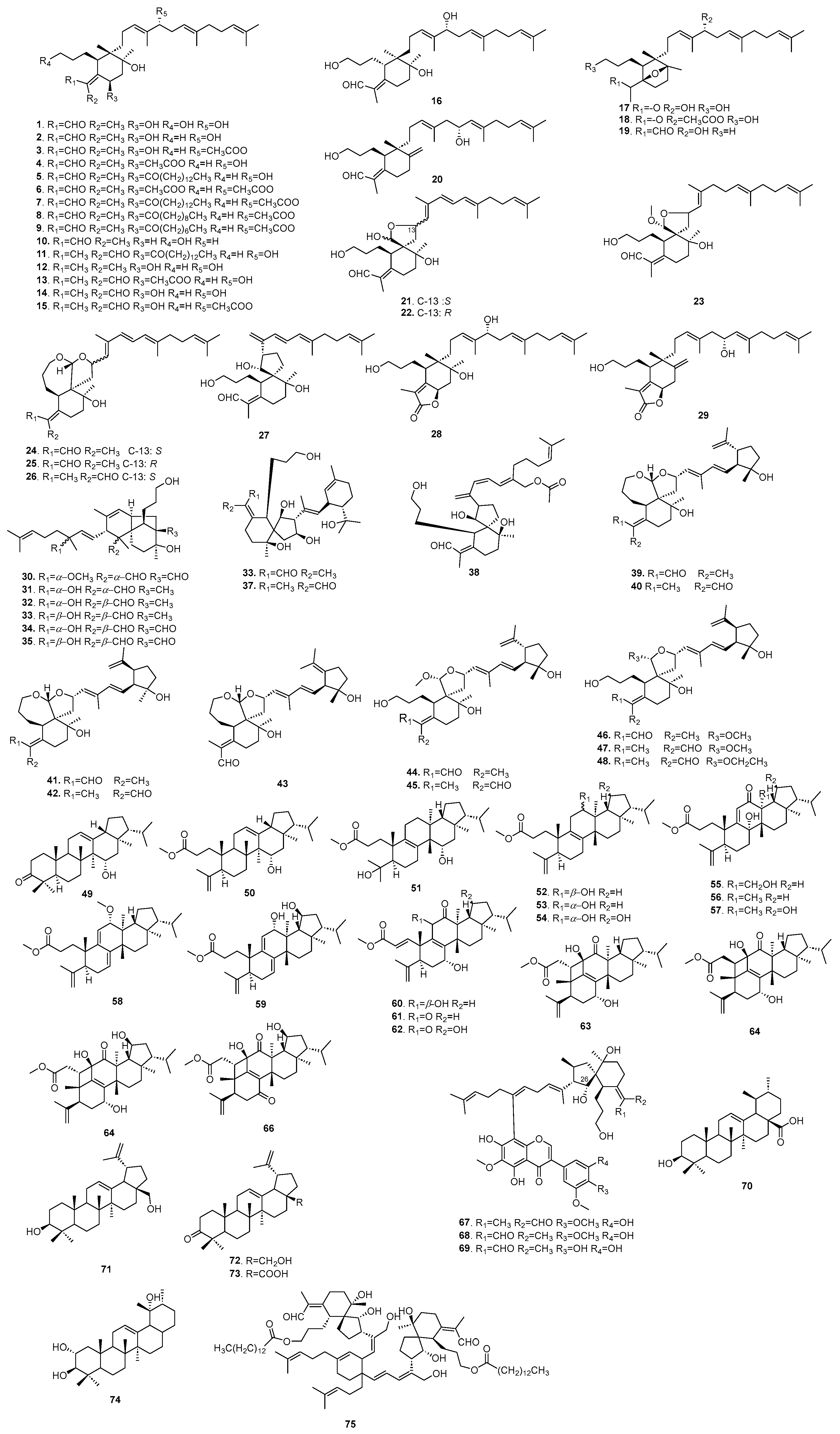 | 46 | Polycycloiridal R | C31H48O6 | Rhizomes | CH2Cl2 | [47] |