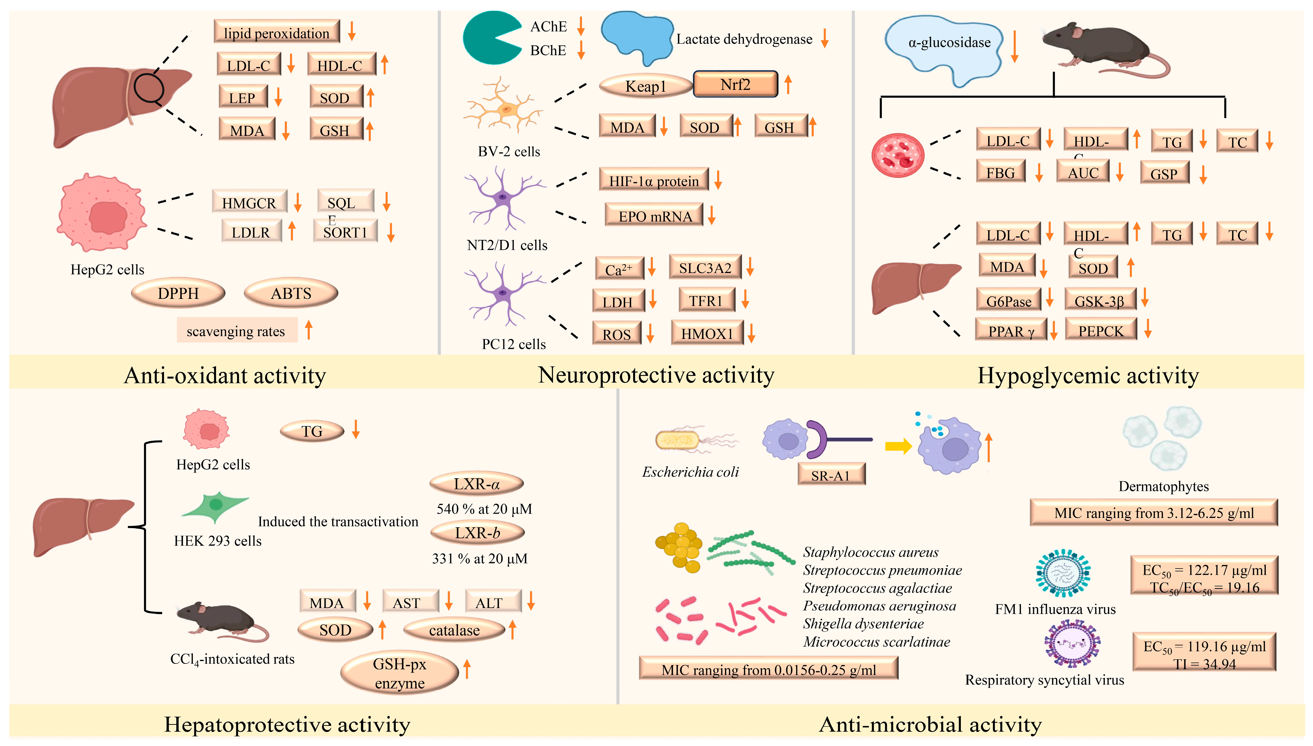| BCLE F1 | In vivo | KK-Ay mice | SOD ↑, MDA ↓, LDL-c ↓, TG ↓, HDL-c ↑ | [15] | |