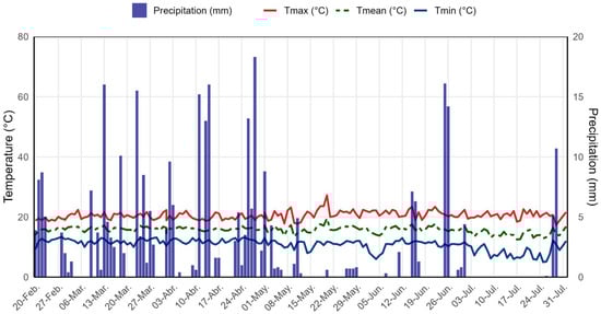 During the study period, daily maximum temperatures ranged from approximately 21 °C to 25 °C, whereas minimum temperatures remained mostly between 10 °C and 12 °C, with occasional drops to slightly lower values (Figure 2). The average ambient temperature fluctuated between 15 °C and 17 °C, consistently positioned between the maximum and minimum values and exhibiting limited variability. Precipitation was irregularly distributed, with numerous dry days interspersed with isolated events exceeding 5 mm and several peaks of greater intensity, some of which reached or surpassed 10–15 mm, reflecting a seasonal rainfall pattern characteristic of the climatic conditions of the area.