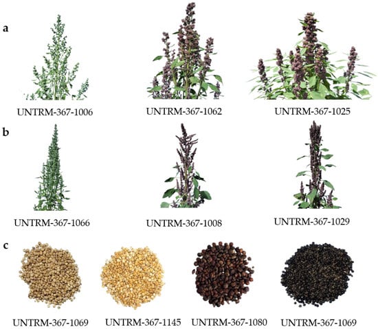Phenotypic diversity observed in panicle traits and seed episperm color within our panel of quinoa accessions: (a) Glomerulated panicles; (b) Amaranthiform panicles; (c) Seeds episperm color variation.