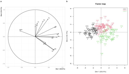 Principal component analysis (PCA) and hierarchical clustering of 158 quinoa accessions (Chenopodium quinoa Willd.) evaluated at the Agricultural, Livestock, and Forestry Experimental Station of Lonya Chico, Amazonas, Peru. (a) Correlation and relationships among quantitative variables. (b) Factor map for individual for hierarchical clustering. Where panicle length (PL, cm), panicle diameter (PD, cm), number of days to 50% flowering (DF, days), number of days to 50% physiological maturity (DM, days), 1000-grain weight (TSW, g), biomass of 10 plants (PB, kg), seed weight from 10 plants (SW, g), chlorophyll content at 50% flowering (SPAD units), plant height (PH, cm), stem diameter (SD, mm), downy mildew severity caused by Peronospora variabilis (IPER, %), and harvest index (HI).