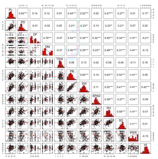 Spearman correlation matrix among morphological and productive variables evaluated in 158 quinoa (Chenopodium quinoa Willd.) accessions. The analyzed quantitative traits included panicle length (PL, cm) and panicle diameter (PD, cm), number of days to 50% flowering (DF, days) and to 50% physiological maturity (DM, days), 1000-grain weight (TSW, g), biomass of 10 plants (PB, kg), seed weight from 10 plants (SW, g), chlorophyll content at 50% flowering (SPAD units), plant height (PH, cm), stem diameter (SD, mm), downy mildew severity caused by Peronospora variabilis (IPER, %), and harvest index (HI). Significance levels: p < 0.05 (*), p < 0.01 (**), p < 0.001 (***).