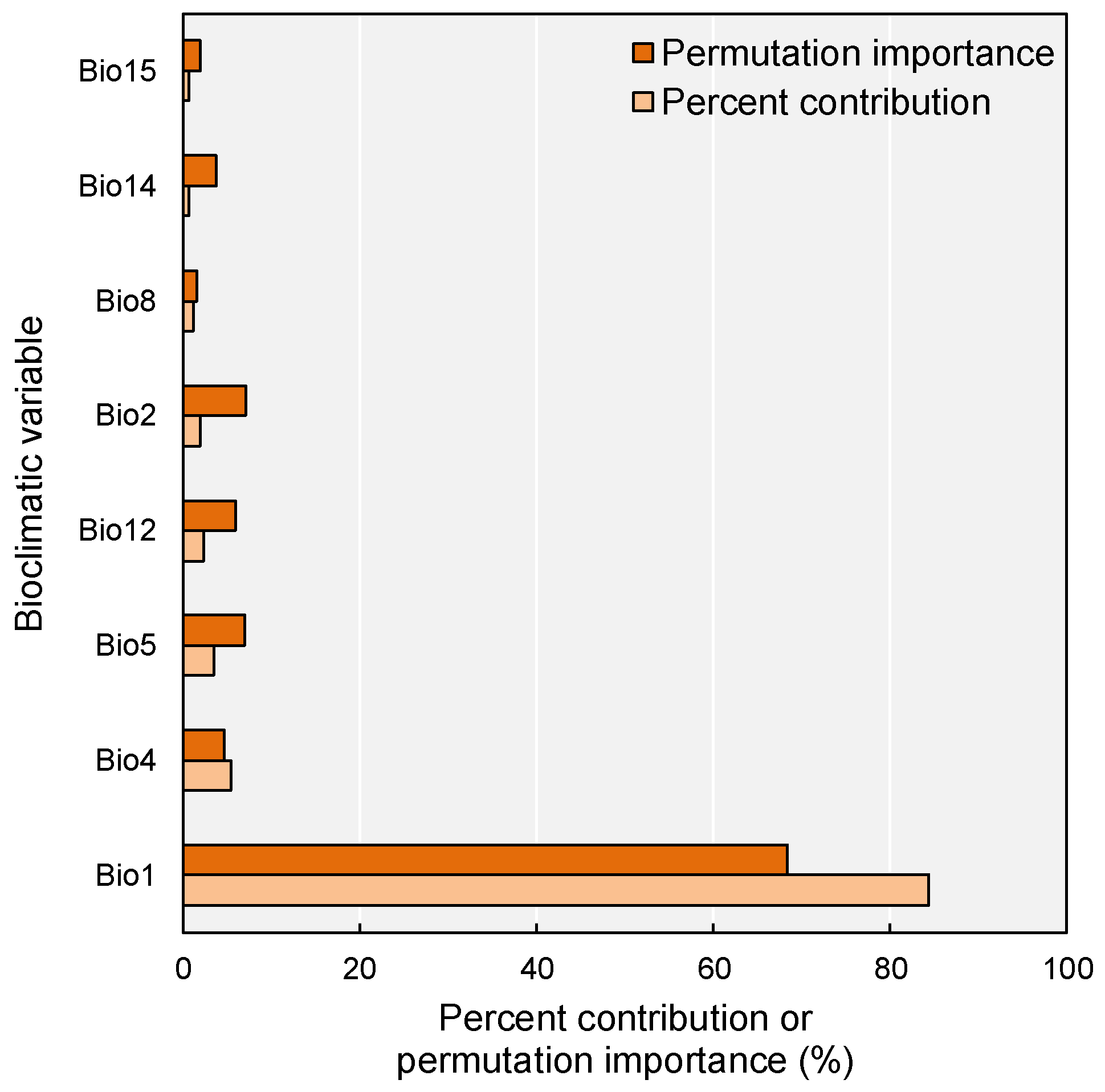 - Muscarella, R.; Galante, P.J.; Soley-Guardia, M.; Boria, R.A.; Kass, J.M.; Uriarte, M.; Anderson, R.P. ENMeval: An R package for conducting spatially independent evaluations and estimating optimal model complexity for MaxEnt ecological niche models. Methods Ecol. Evol. 2014, 5, 1198–1205. [Google Scholar] [CrossRef]